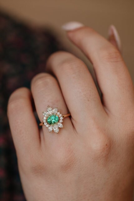 A captivating 18k solid gold engagement ring featuring a cluster of teal sapphires, offering a unique and elegant design that stands out.