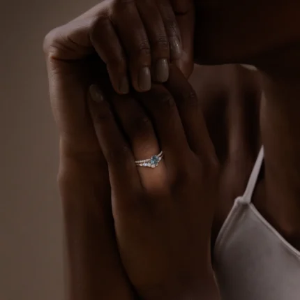 18K Solid Gold Threaded Ring with Pave Band, 0.65ct. Greenish Blue Sapphire Ring