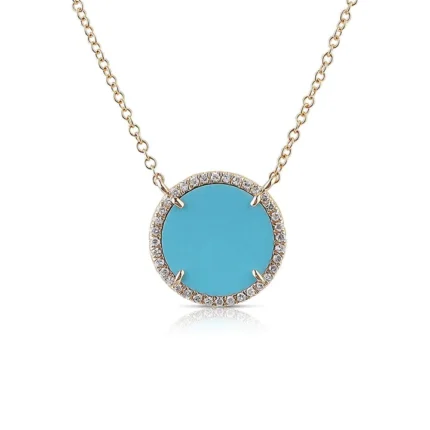 Elegant 18k solid gold round necklace with turquoise and diamonds, combining vibrant color and sparkle for a luxurious, timeless accessory.