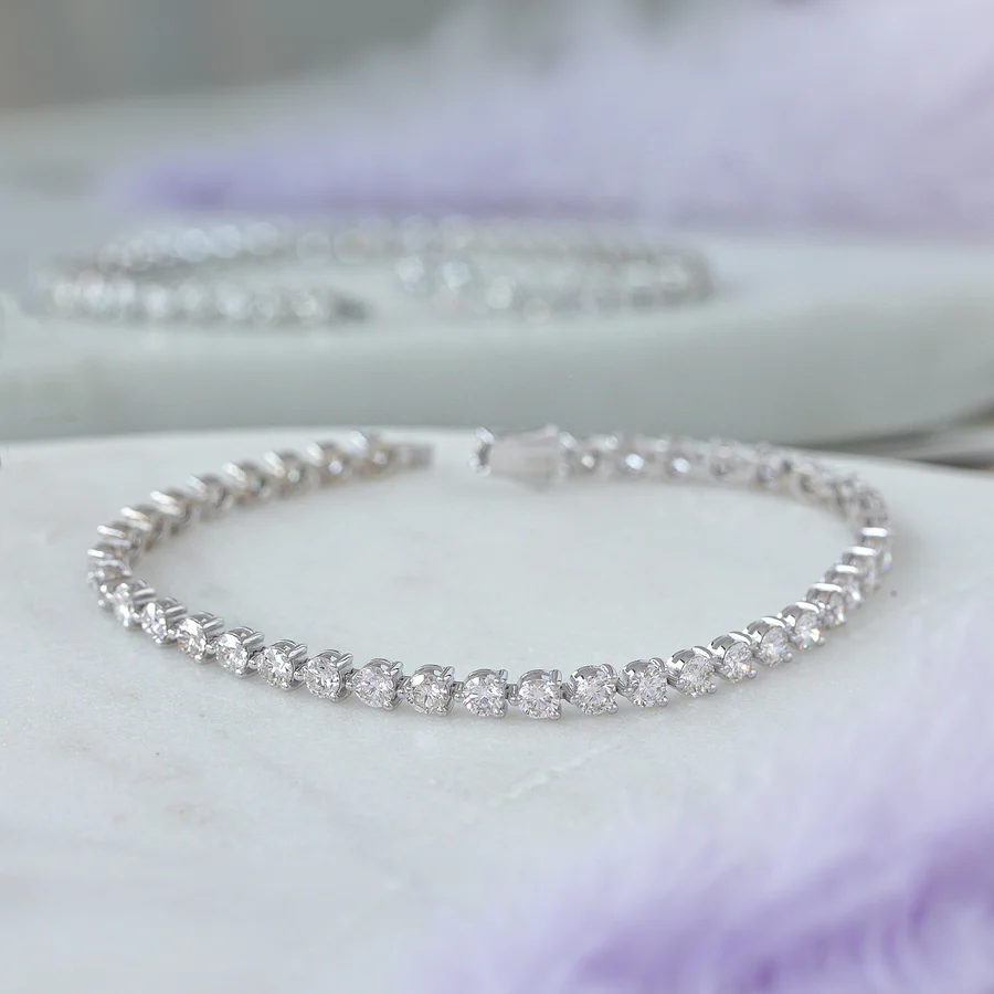 - The 3.25mm diamonds deliver maximum visual weight, making the bracelet feel bold and highly noticeable despite its compact size. Combined with the 3 prong setting, each diamond remains fully exposed, allowing light to reflect directly and consistently. The reflections are strong and concentrated, creating a sharp, defined light pattern rather than a soft glow.