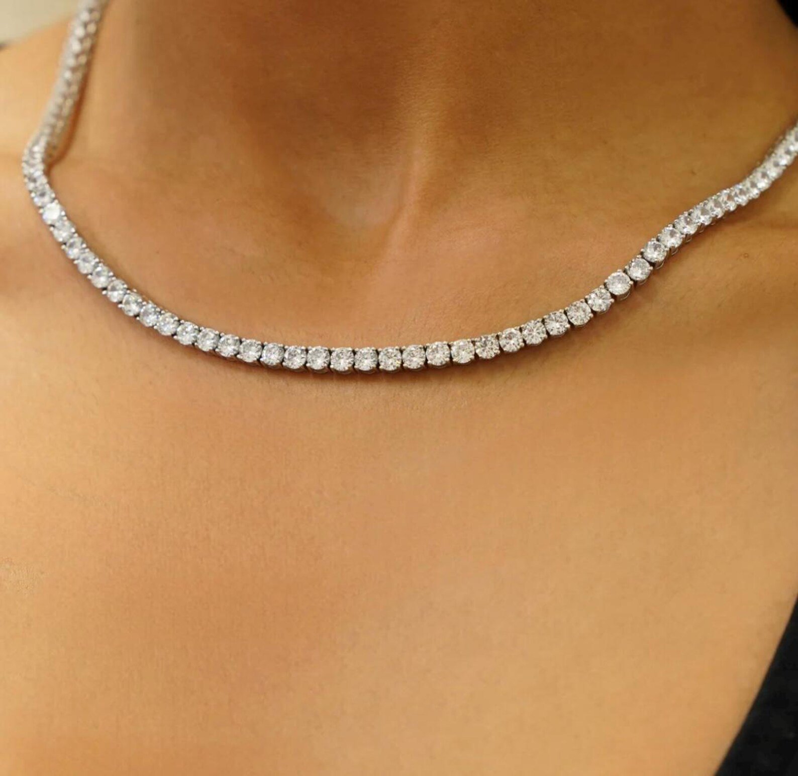 - The 5.80mm diamonds give the necklace a wide, heavy profile, while the 4-prong setting adds a defined structure. Each diamond reflects light individually, creating depth and variation instead of a flat, uniform shine.
