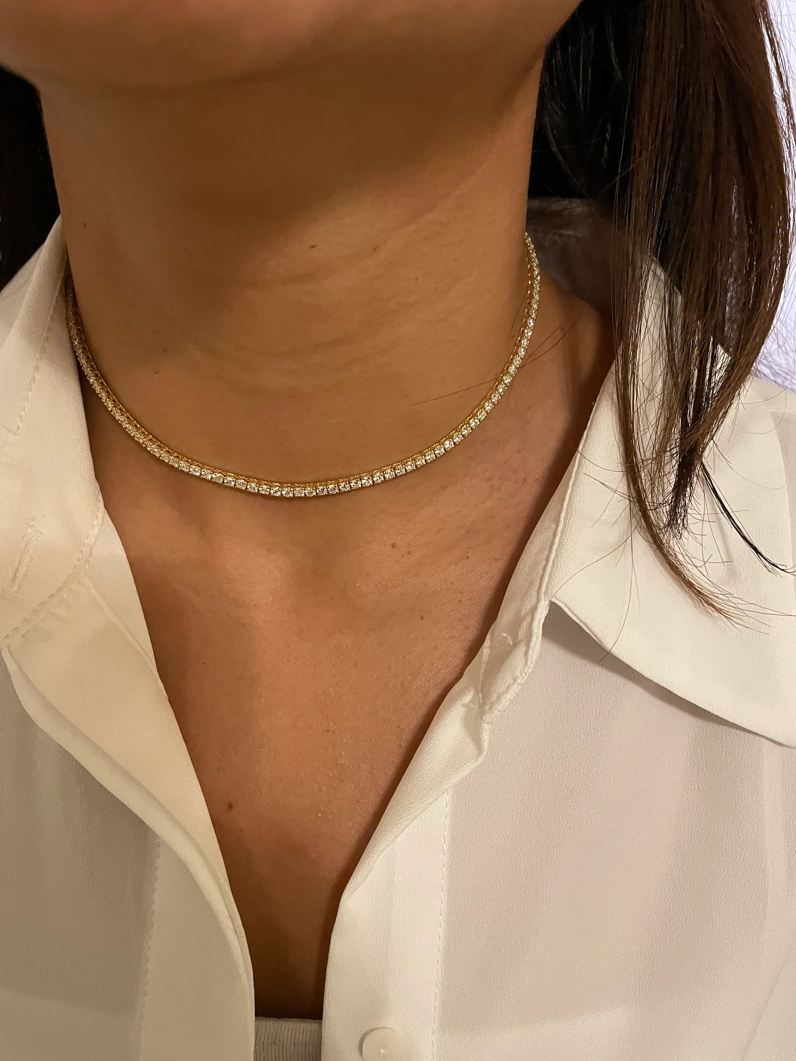 • The 5.50mm diamonds give the necklace a wide, heavy profile, while the 4-prong setting adds a defined structure. Each diamond reflects light individually, creating depth and variation instead of a flat, uniform shine.