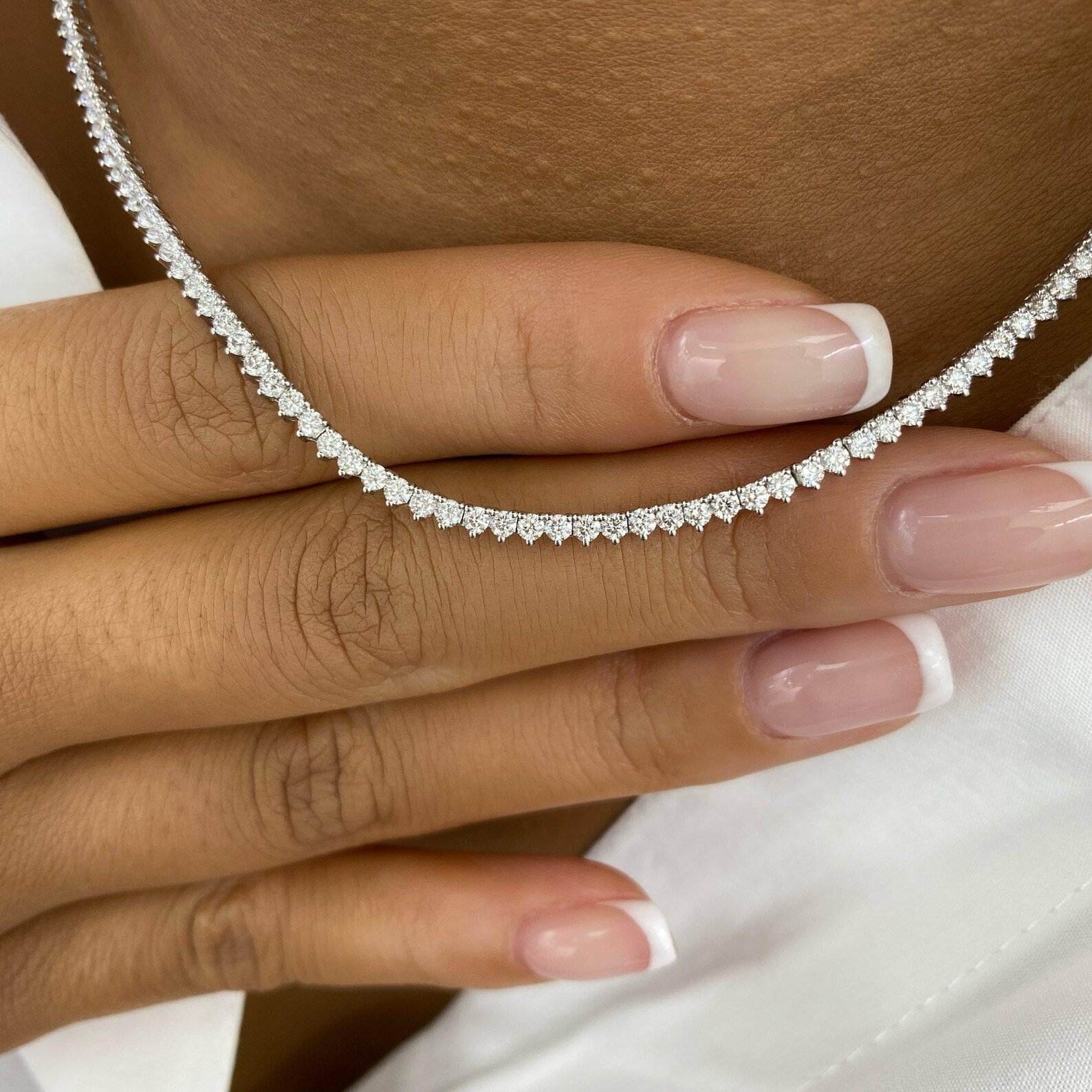 - The 3-prong setting allows light to pass through each diamond, creating slight variations in reflection. Instead of a uniform shine, the necklace produces a more dynamic, shifting sparkle that feels elevated in motion.
