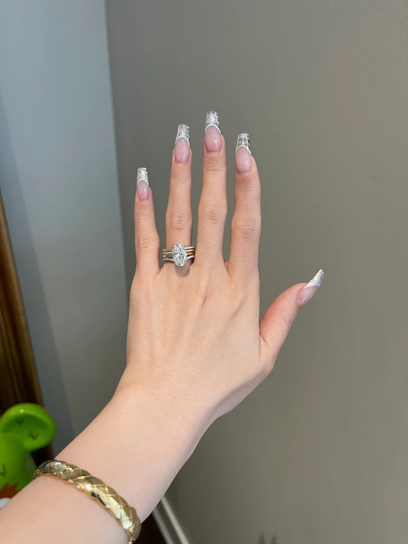This ring houses a 4-carat oval-cut moissanite as the centerpiece, radiating fire and brilliance and making the piece a stunning focal point.