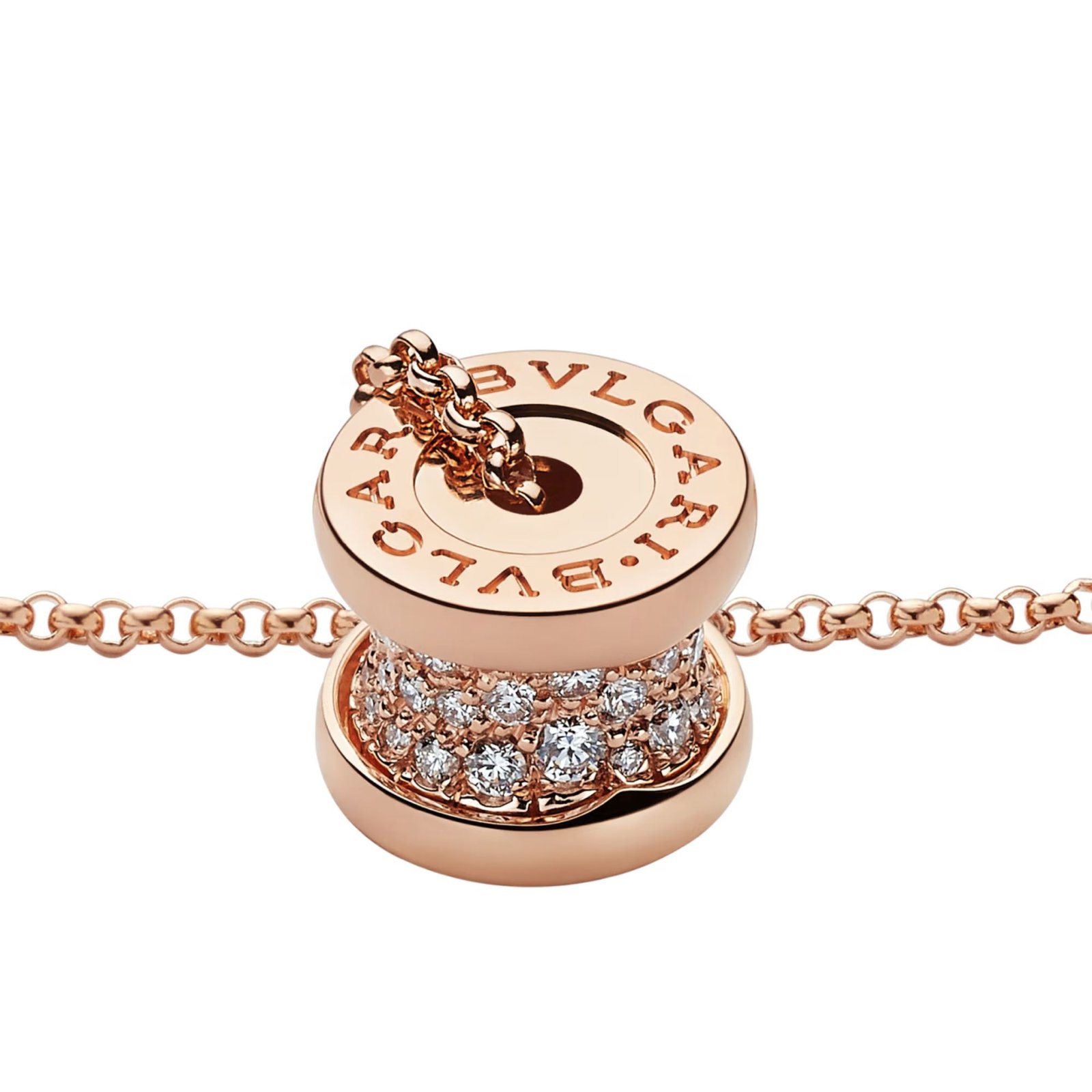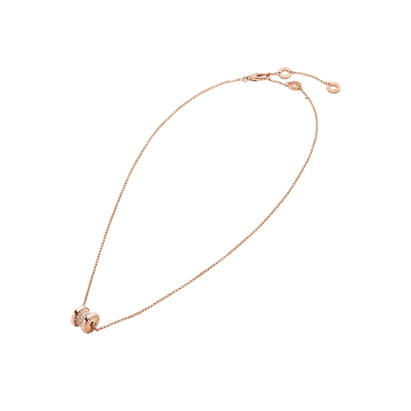 B.zero1 necklace with 18K rose gold chain and 18K rose gold pendant set with pavé diamonds on the spiral.