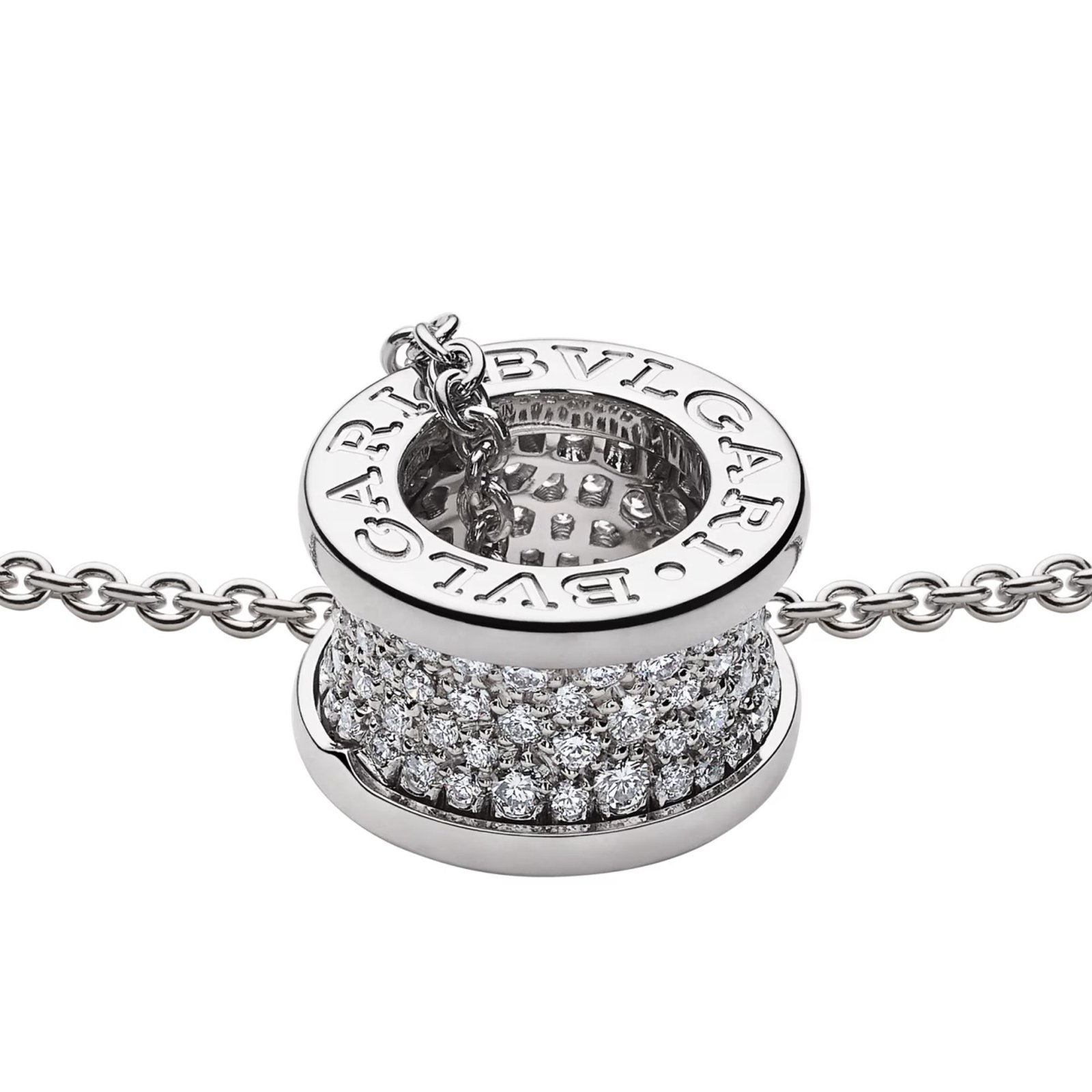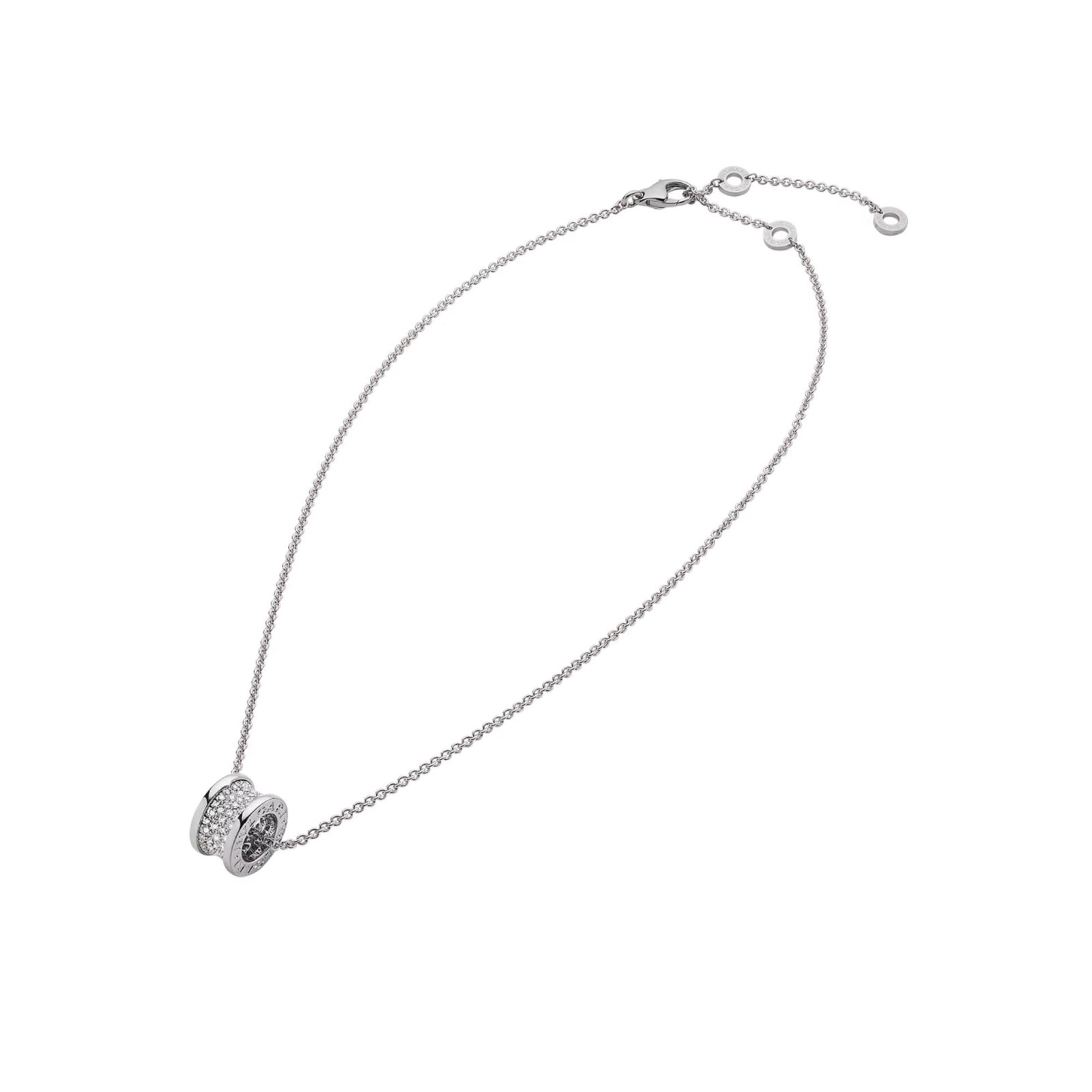 B.zero1 necklace with 18K white gold chain and pendant in 18K white gold set with pavé diamonds on the spiral.