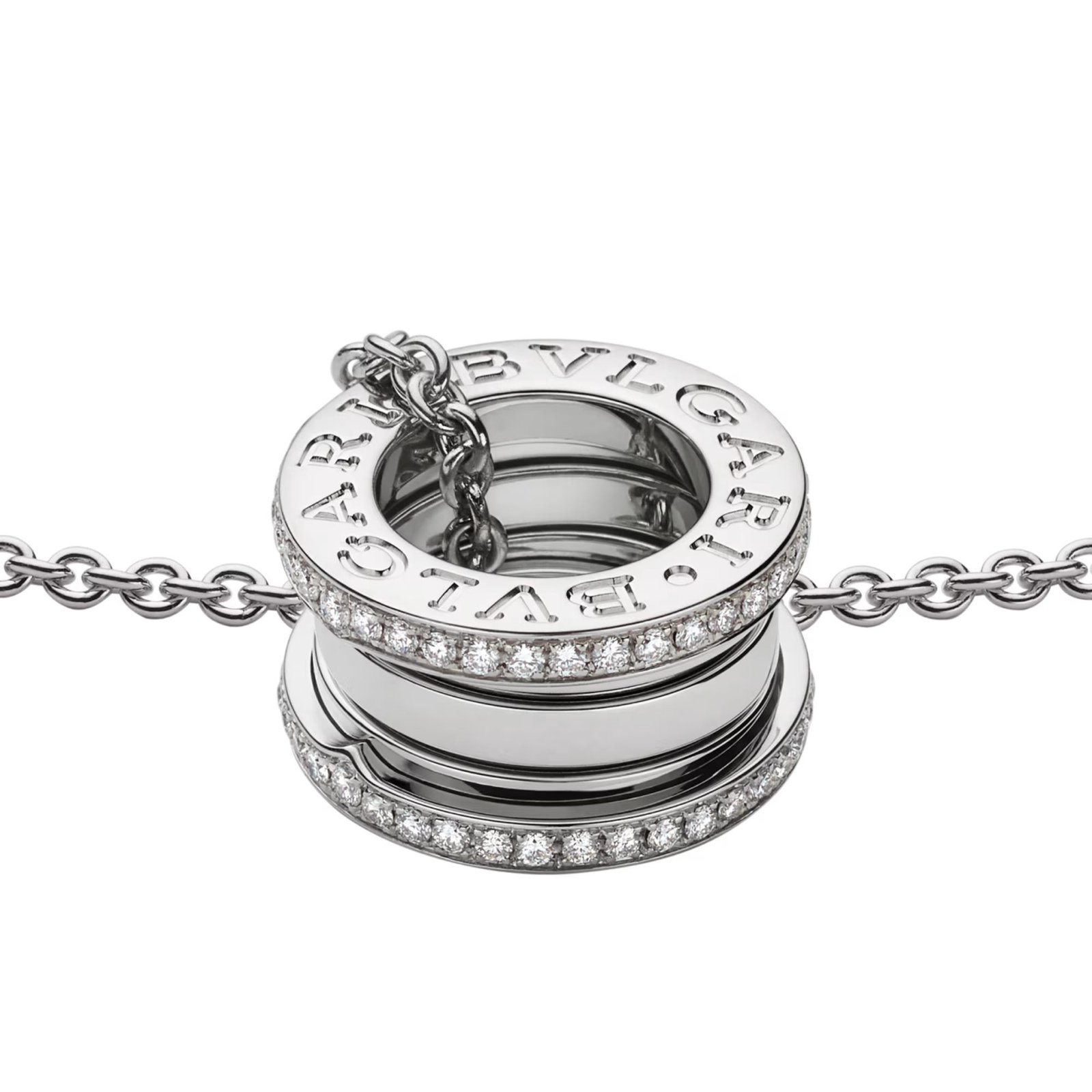 B.zero1 pendant with chain in 18K white gold with pavé diamonds on the edges. 14.96–17.70 in (38–45 cm) long.