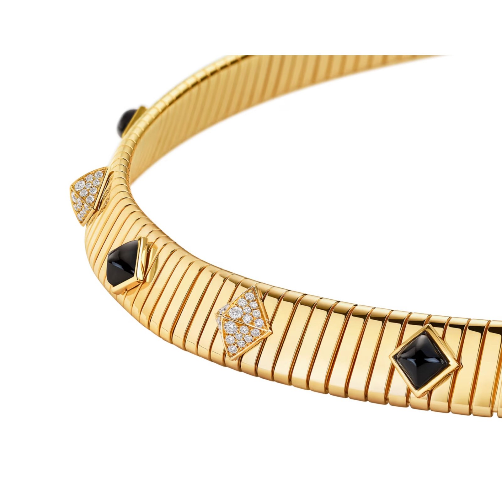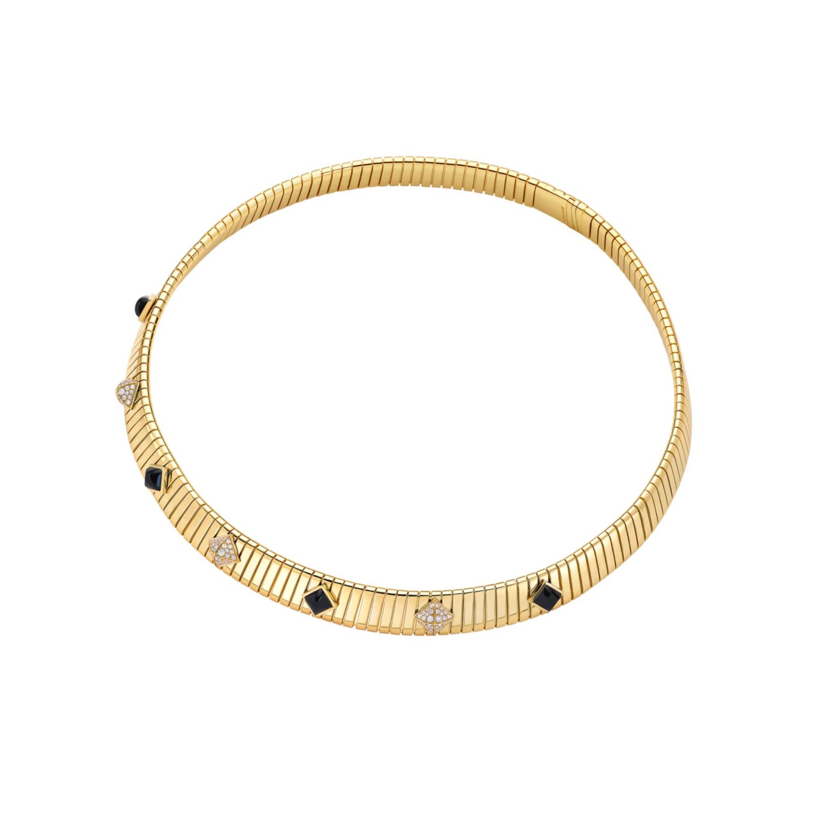 Crafted in 18K yellow gold, the necklace is set with diamond pavé and black onyx geometric studs. The striking contrast between radiant diamonds and deep black onyx enhances the creation’s eternally contemporary and unmistakably distinctive style. A refined yet powerful statement piece, rooted in Roman heritage and defined by modern elegance.