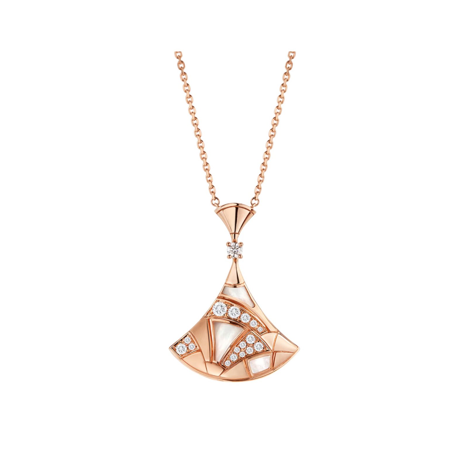 Pre-Owned Bvlgari Divas’ Dream 18K rose gold necklace with mother-of-pearl, one diamond and pavé diamonds.