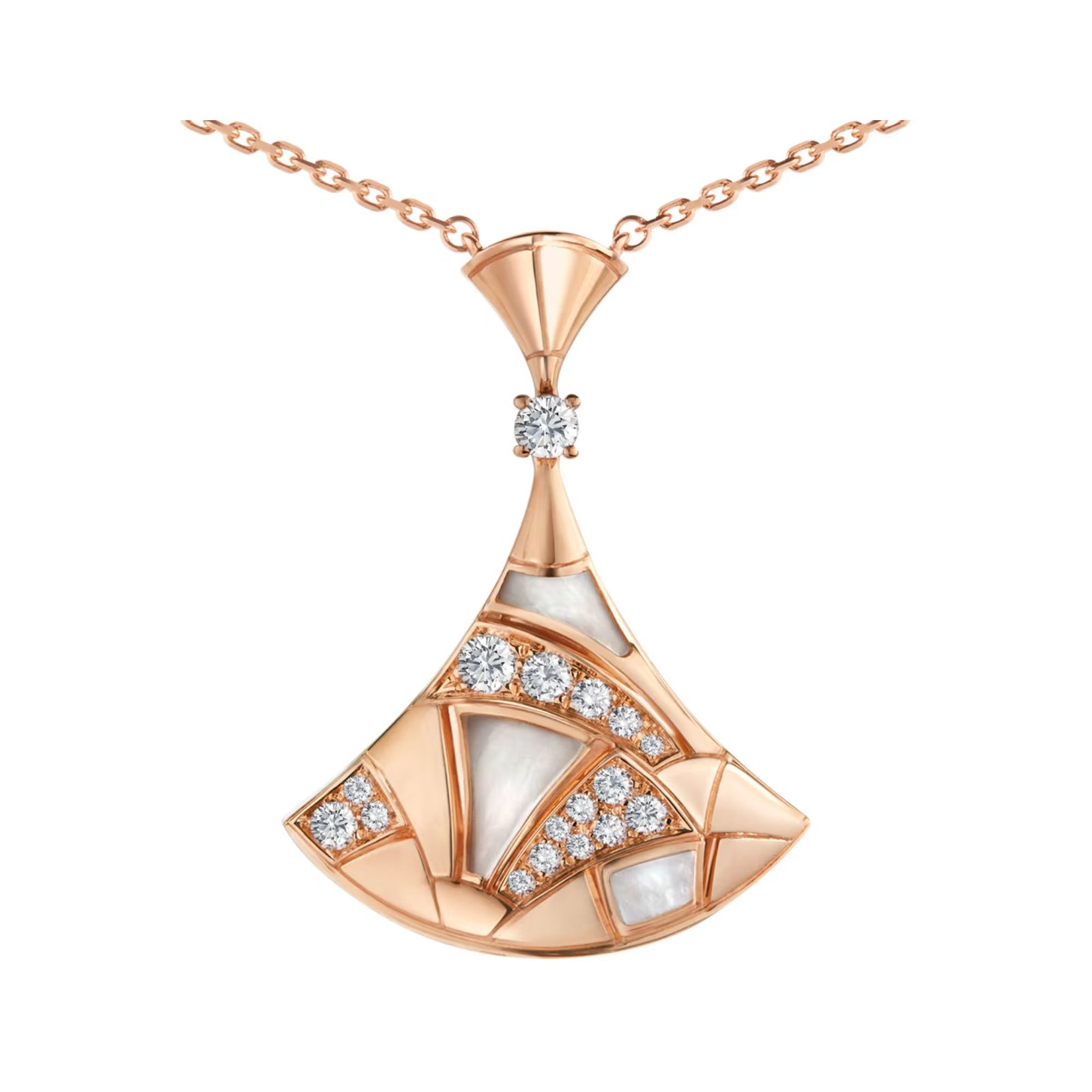 Divas’ Dream necklace in 18K rose gold with mother-of-pearl and pavé diamonds.