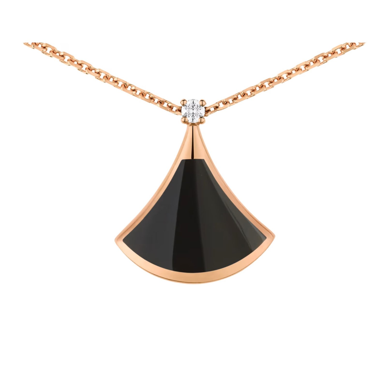 Divas’ Dream necklace in 18K rose gold with 18K rose gold pendant set with onyx and one diamond.