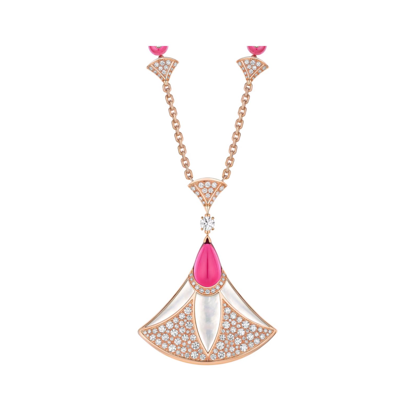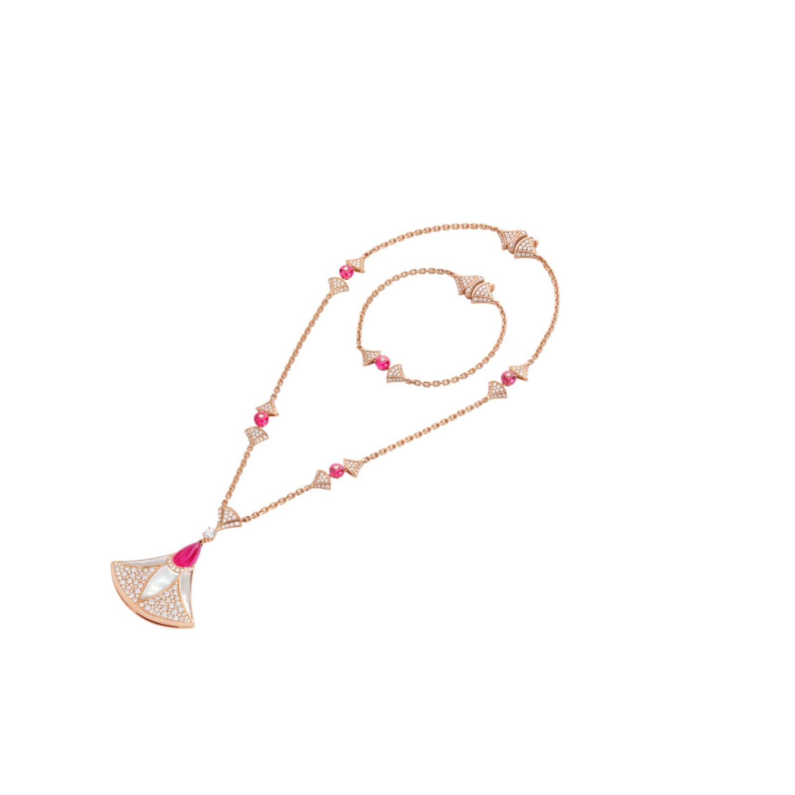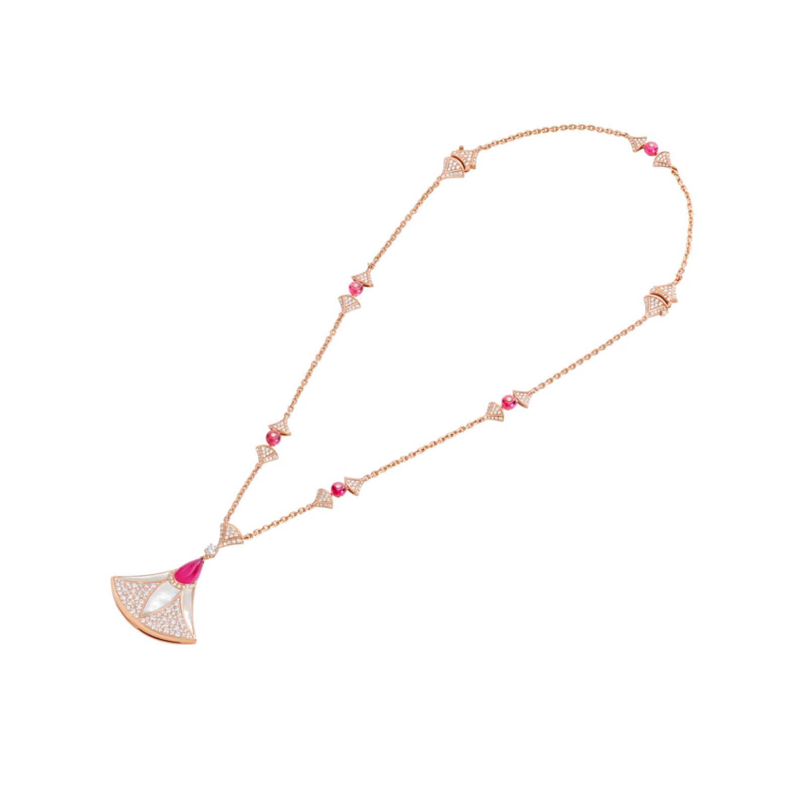 Pre-Owned Bvlgari Divas’ Dream 18K rose gold necklace with pear-shaped rubellite, rubellite beads, mother-of-pearl inserts and pavé diamonds.