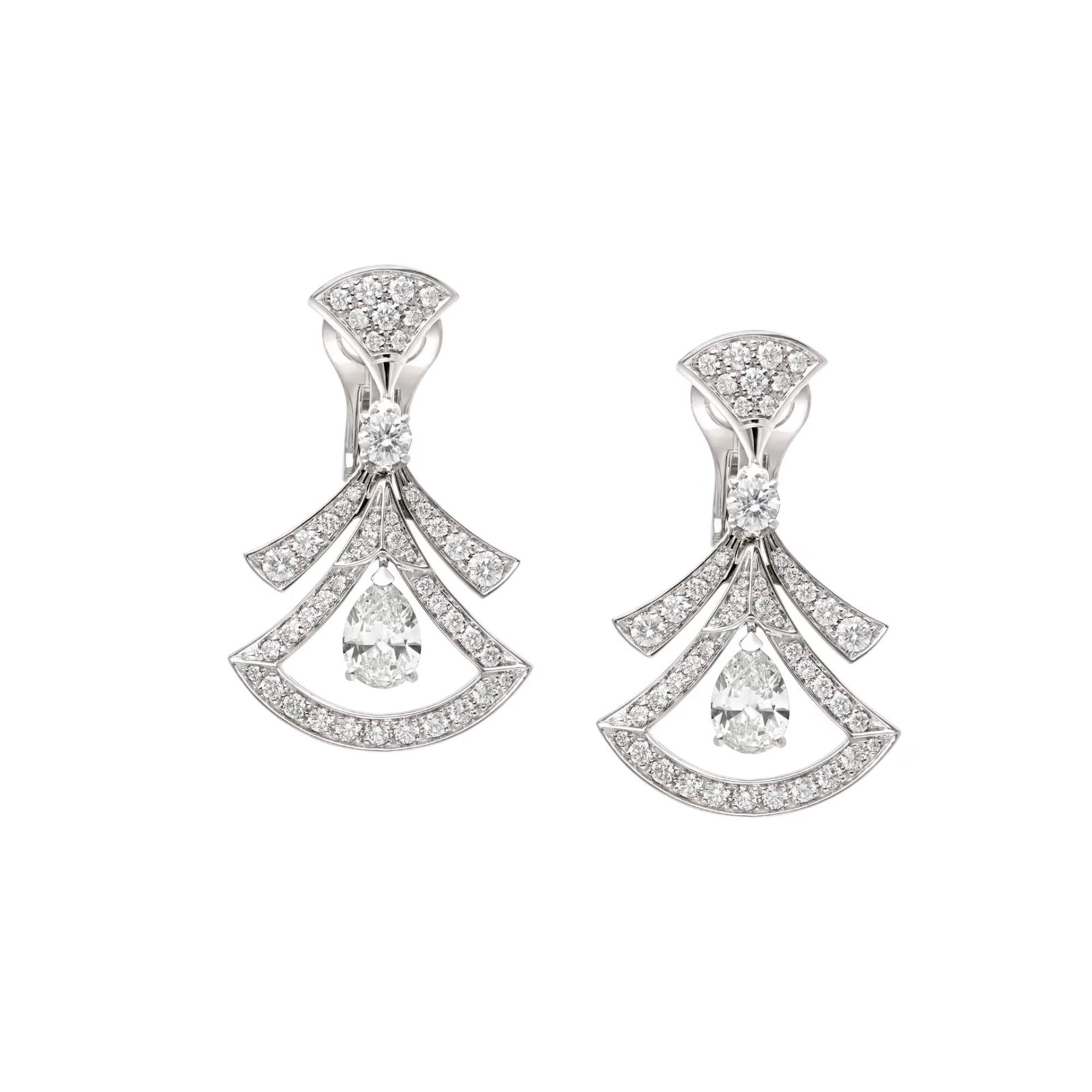 Pre-Owned Bvlgari Divas’ Dream 18K white gold earrings with pear-shaped, round brilliant-cut and pavé diamonds.