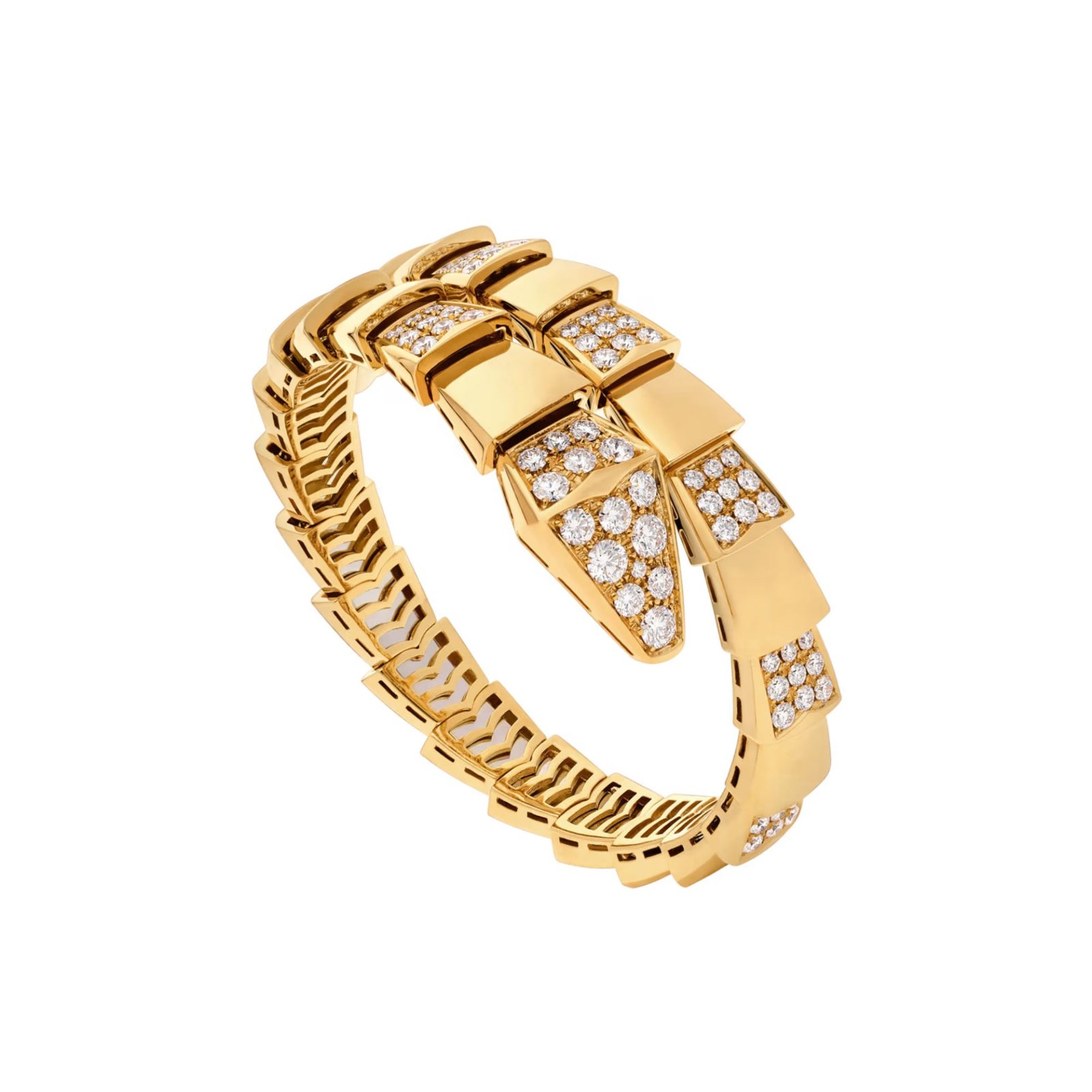 Crafted in 18K yellow gold, the bracelet is set with demi pavé diamonds, enhancing the serpent’s sleek silhouette with refined brilliance. Magnetic and versatile, this elegant creation is easy to mix and match, offering endless styling possibilities while expressing the dynamic spirit and timeless sophistication of the Serpenti collection.