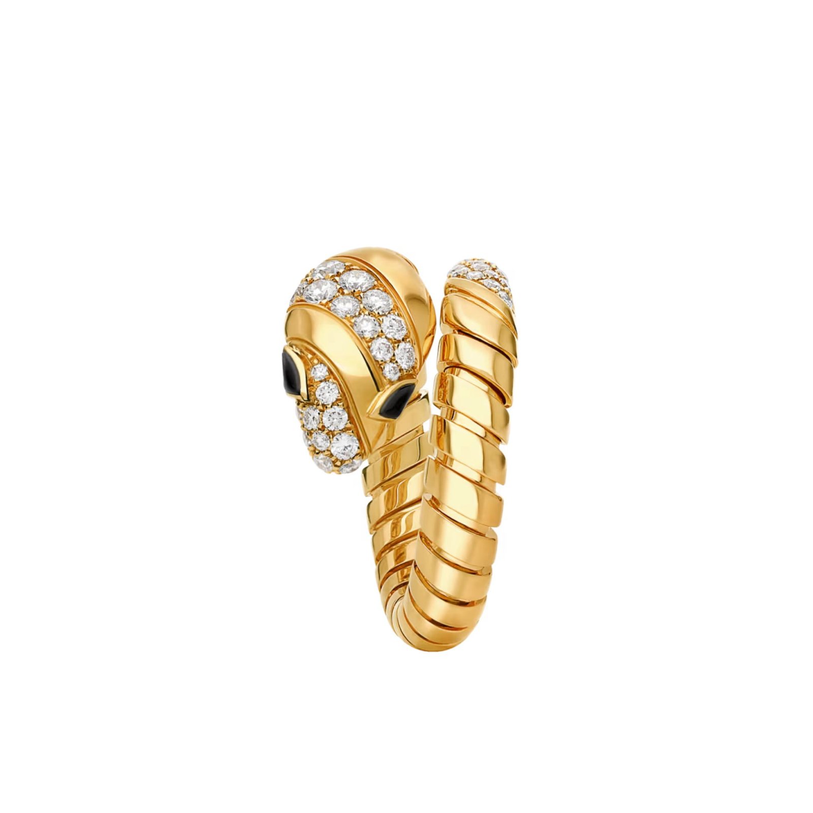 Pre-Owned Bvlgari Serpenti Tubogas 18K yellow gold one-coil ring with demi pavé diamonds and black onyx eyes.