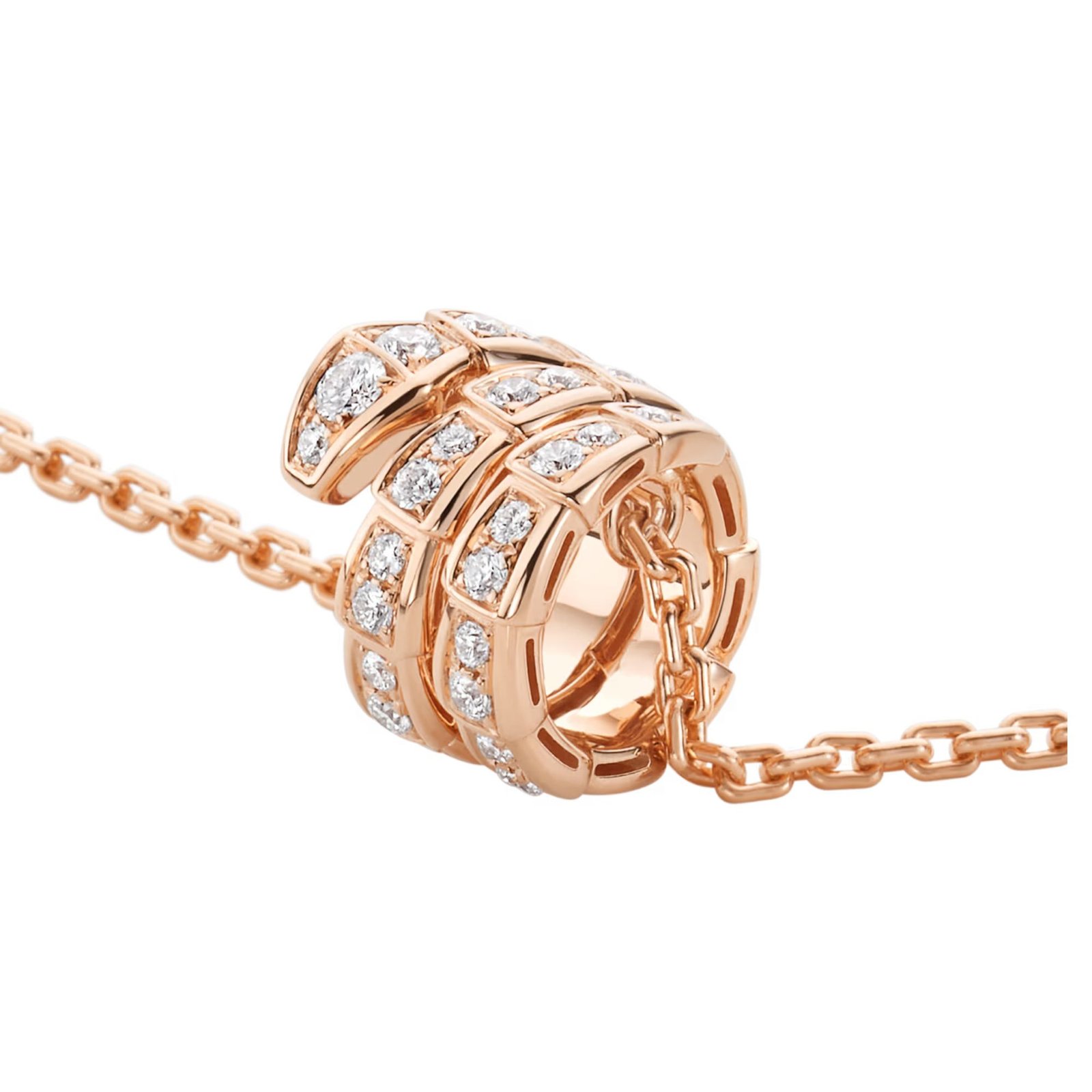Serpenti Viper 18K rose gold pendant necklace set with full pavé diamonds.