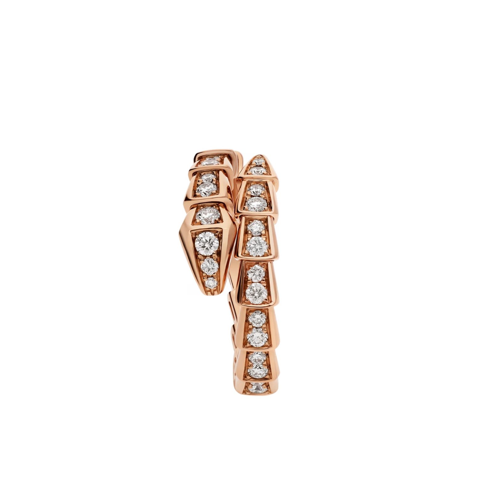 Crafted in 18K rose gold, the one-coil silhouette wraps gracefully around the finger and is entirely set with full pavé diamonds, enveloping the piece in radiant brilliance. The continuous diamond setting enhances the sculptural form with exceptional luminosity, creating a refined balance between bold character and timeless elegance. Versatile and expressive, the ring can be worn alone or layered to reflect the dynamic spirit of Serpenti.