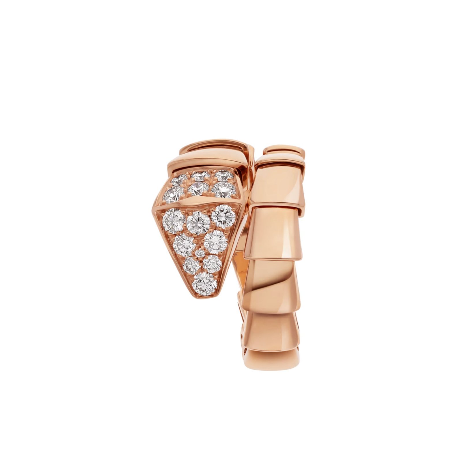 Crafted in 18K rose gold, the one-coil silhouette wraps gracefully around the finger and is set with pavé diamonds on the head. The refined diamond detailing enhances the sculptural form with radiant brilliance, creating a harmonious balance between bold character and timeless elegance. Versatile and expressive, the ring can be worn alone or layered to reflect the dynamic spirit of Serpenti.