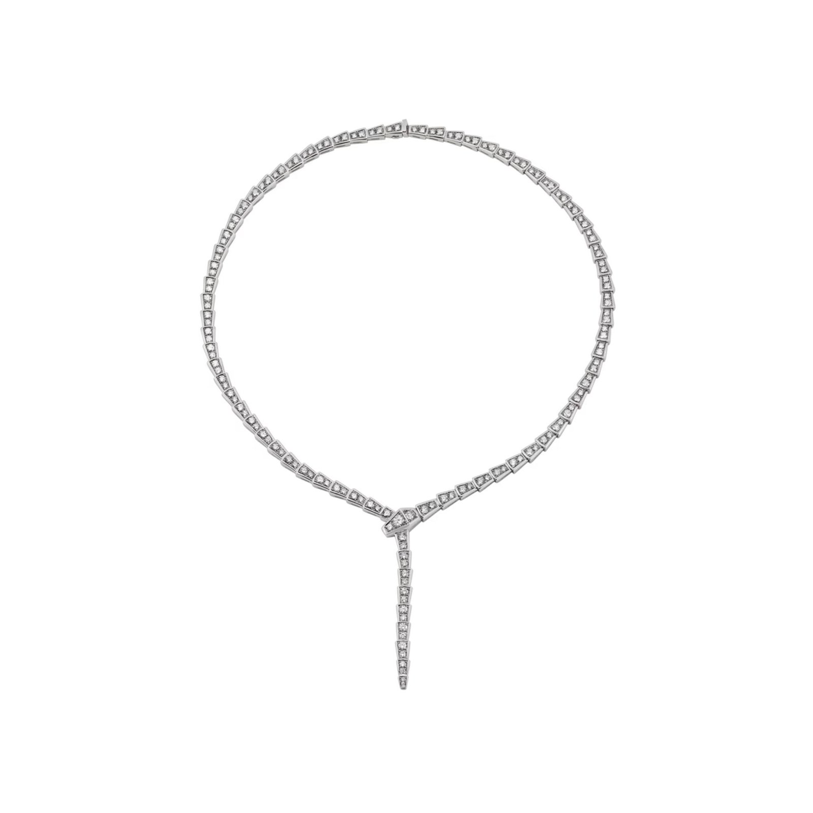 Crafted in 18K white gold and set with full pavé diamonds, the necklace enchants with the precious beauty of its shimmering scales. Coiling gracefully around the neck, it radiates brilliance from every angle, blending temptation and timeless style in a striking expression of the Serpenti collection’s enduring allure.