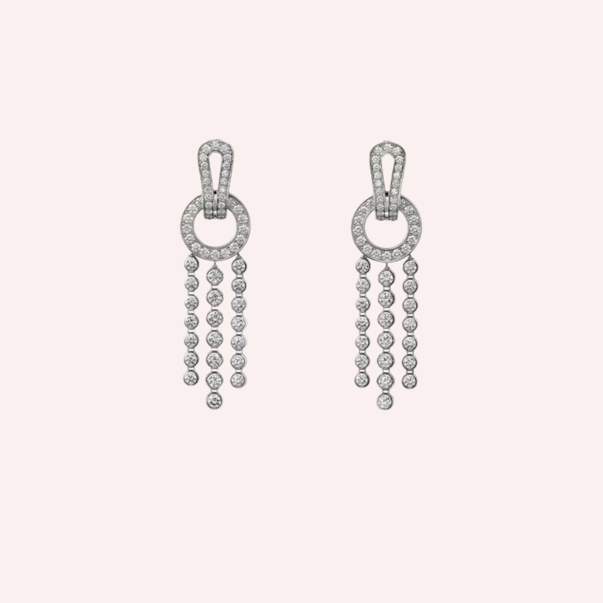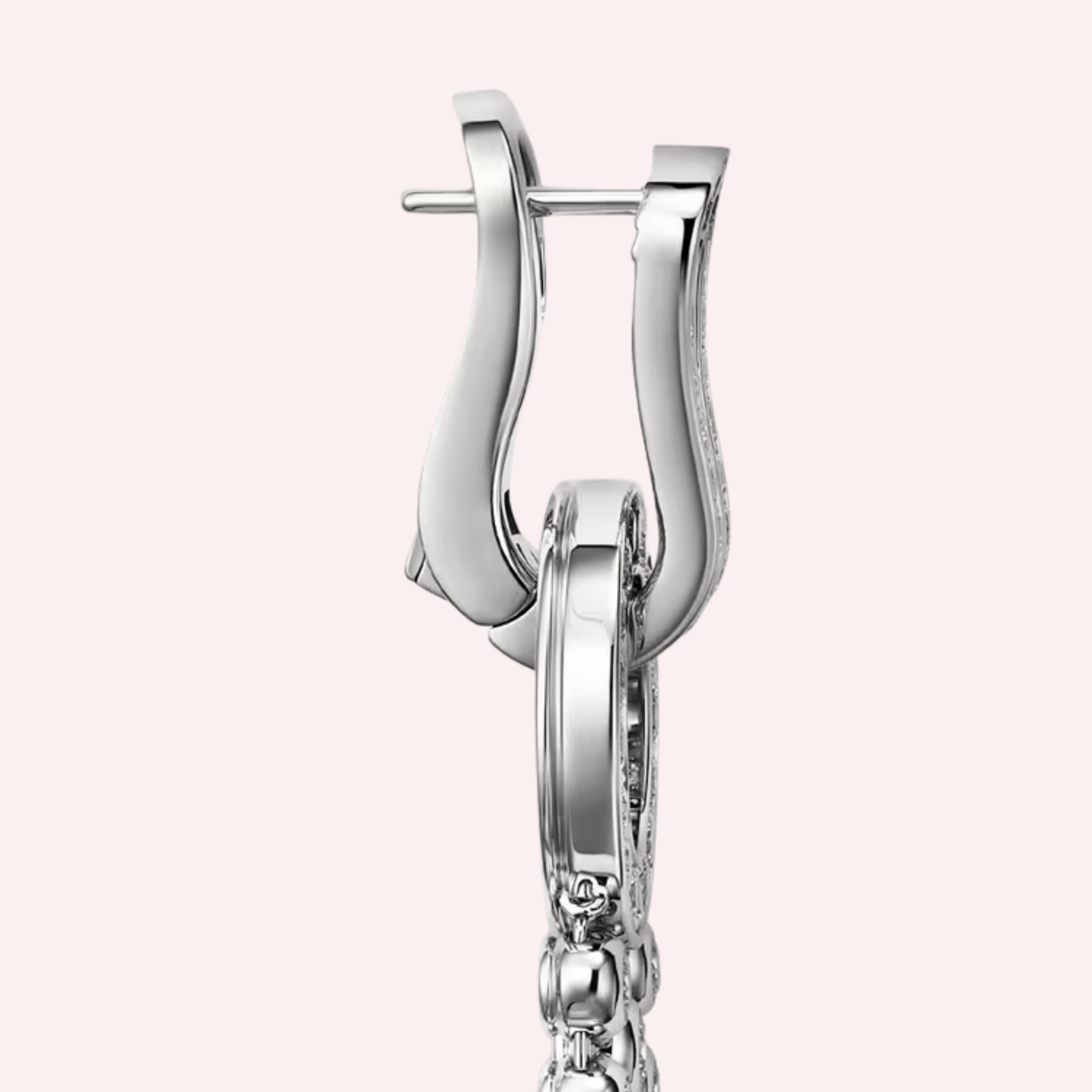 Crafted in luminous 18K white gold (750/1000), these pavé Agrafe earrings are exquisitely set with 126 brilliant-cut diamonds totaling 3.31 carats. The diamonds are meticulously arranged to enhance the supple, elongated form of the design, creating exceptional brilliance and a graceful sense of motion. Measuring 49.25 mm in length, the earrings offer a striking yet elegant presence, perfectly balancing bold design with refined femininity.