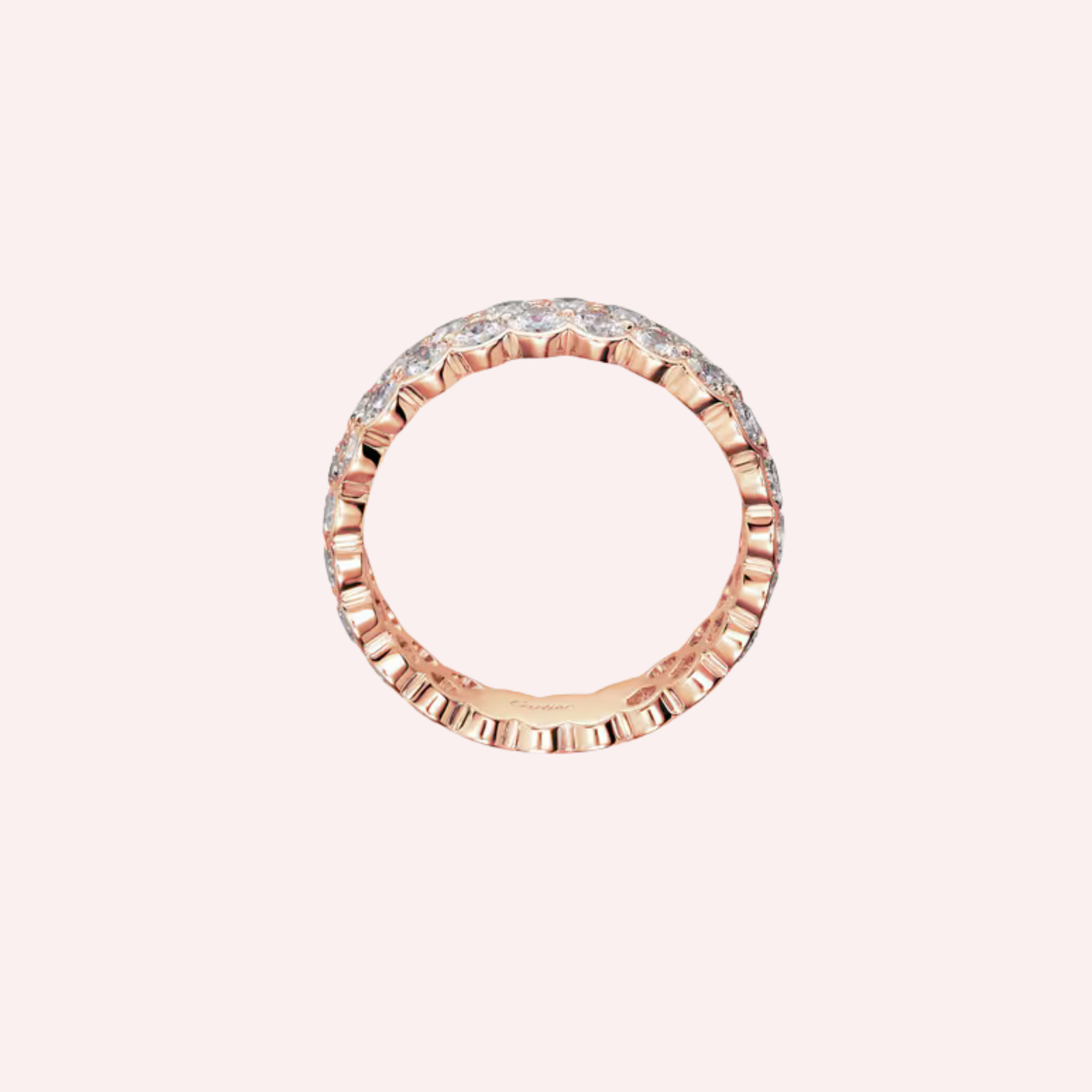 Expertly crafted in 18K rose gold (750/1000), the band is adorned with 46 brilliant-cut diamonds totaling 2.60 carats (for size 52). The generous diamond setting delivers exceptional radiance, while the warm blush tone of rose gold enhances its romantic and sophisticated character. A truly captivating piece, perfect for marking life’s most meaningful moments.