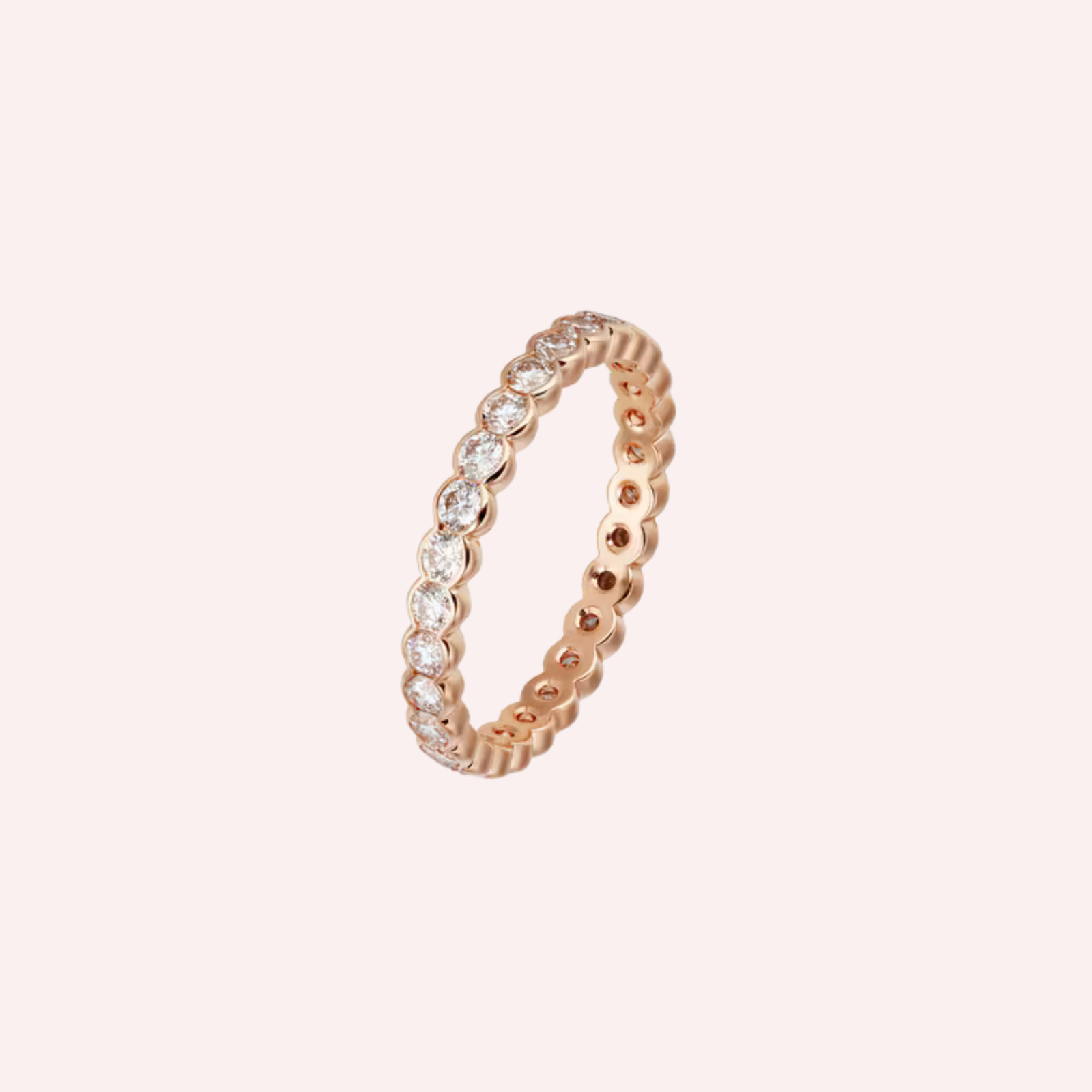 Expertly crafted in 18K rose gold (750/1000), the band features a graceful 2.7 mm width and is set with 28 brilliant-cut diamonds totaling 0.78 carats (for size 52). The radiant diamonds create a subtle yet captivating shimmer, beautifully complementing the warm blush tone of the gold. A refined statement of timeless romance and understated sophistication.