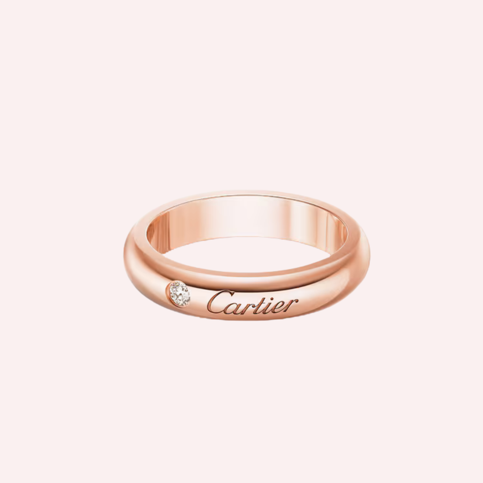 Pre-Owned Cartier C de Cartier wedding band in 18K rose gold, set with one 0.03 ct diamond and an elegant 4 mm width.