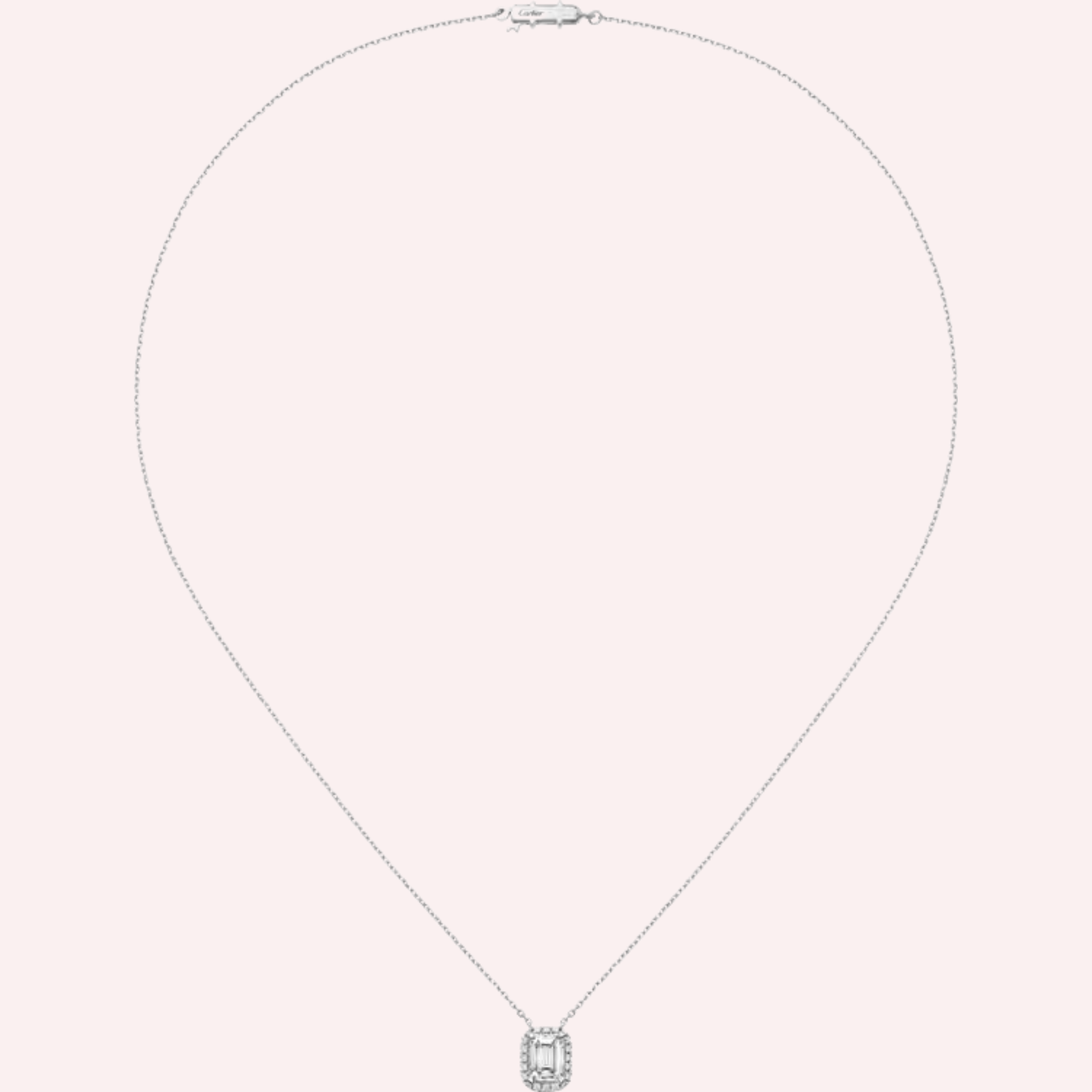 A pre-owned Cartier Destinée pendant necklace in 18K white gold, featuring an emerald-cut diamond framed by pavé-set brilliant-cut diamonds.