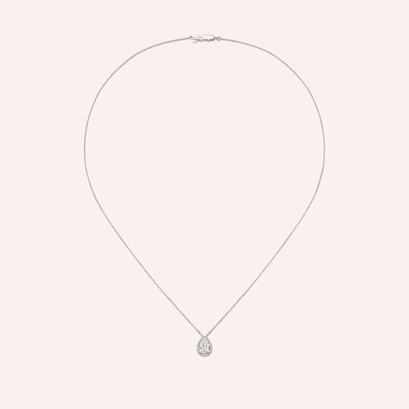 Crafted in luminous 18K white gold (750/1000), this elegant pendant is set with a pear-shaped diamond available in sizes ranging from 0.50–0.59 carats and 1.00–1.15 carats. The elongated silhouette of the center stone is beautifully framed by pavé-set brilliant-cut diamonds, enhancing its brilliance while preserving a refined, perfectly balanced aesthetic. Finished with a 42 cm chain, this necklace is a sophisticated statement of enduring beauty and Cartier’s exceptional diamond craftsmanship.