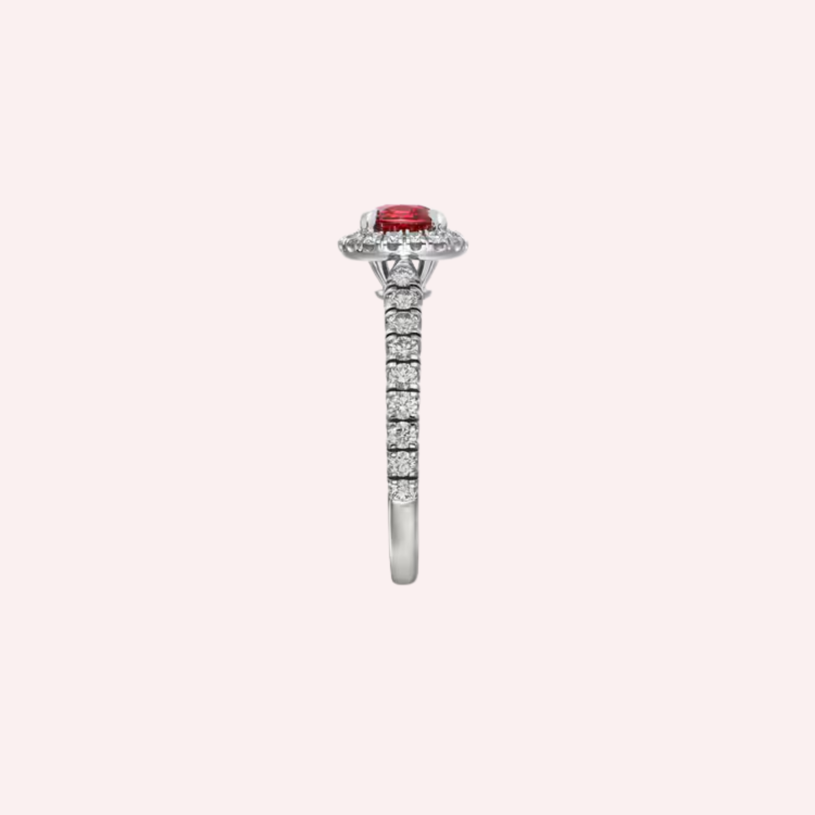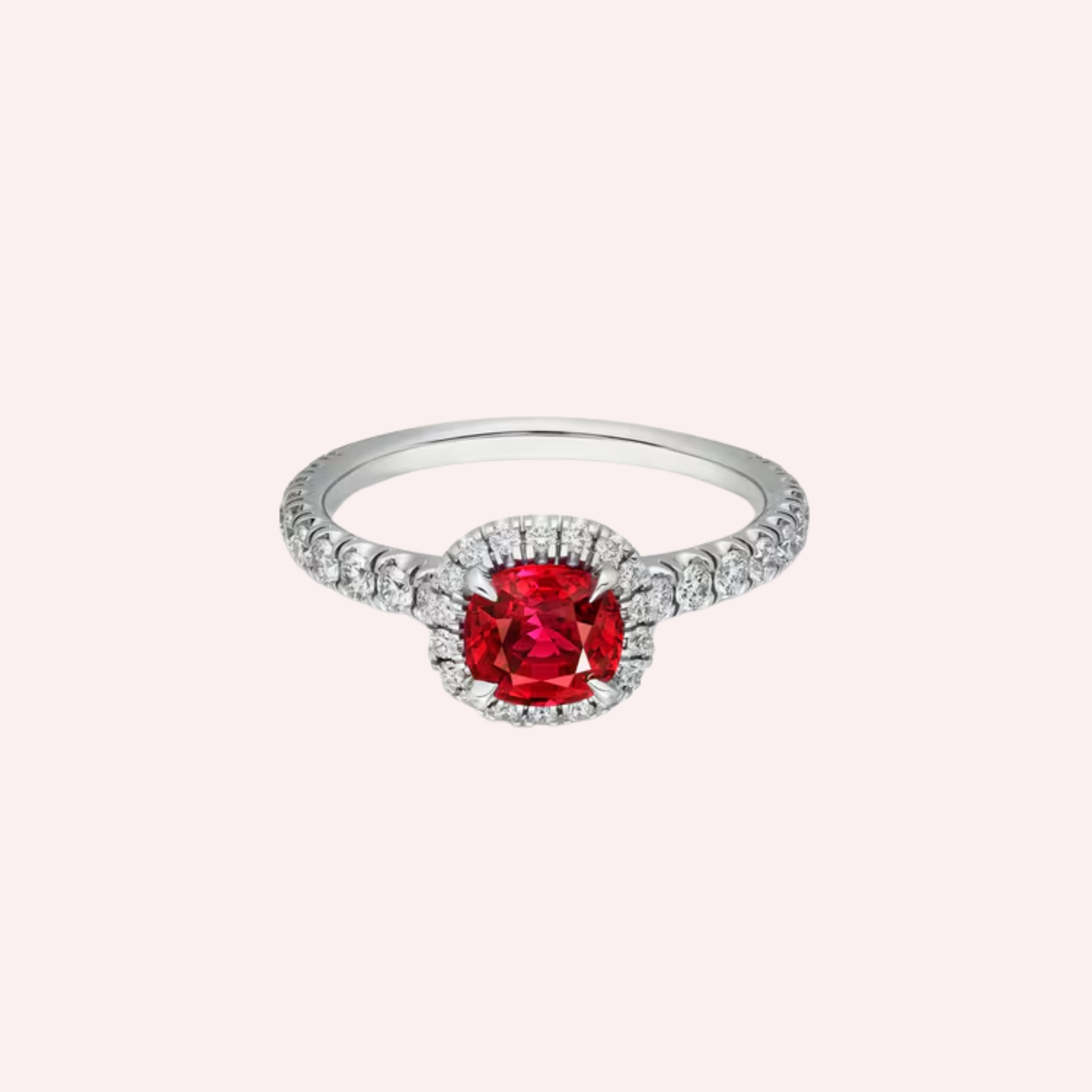 Crafted in platinum 950/1000, this refined solitaire is set with a striking cushion-cut ruby, available in sizes ranging from 1.00 to 1.99 carats. The vibrant ruby is framed by pavé-set brilliant-cut diamonds, creating a captivating play of light and a harmonious balance between color and brilliance. Every detail reflects Cartier’s mastery of proportion, precision, and enduring luxury.