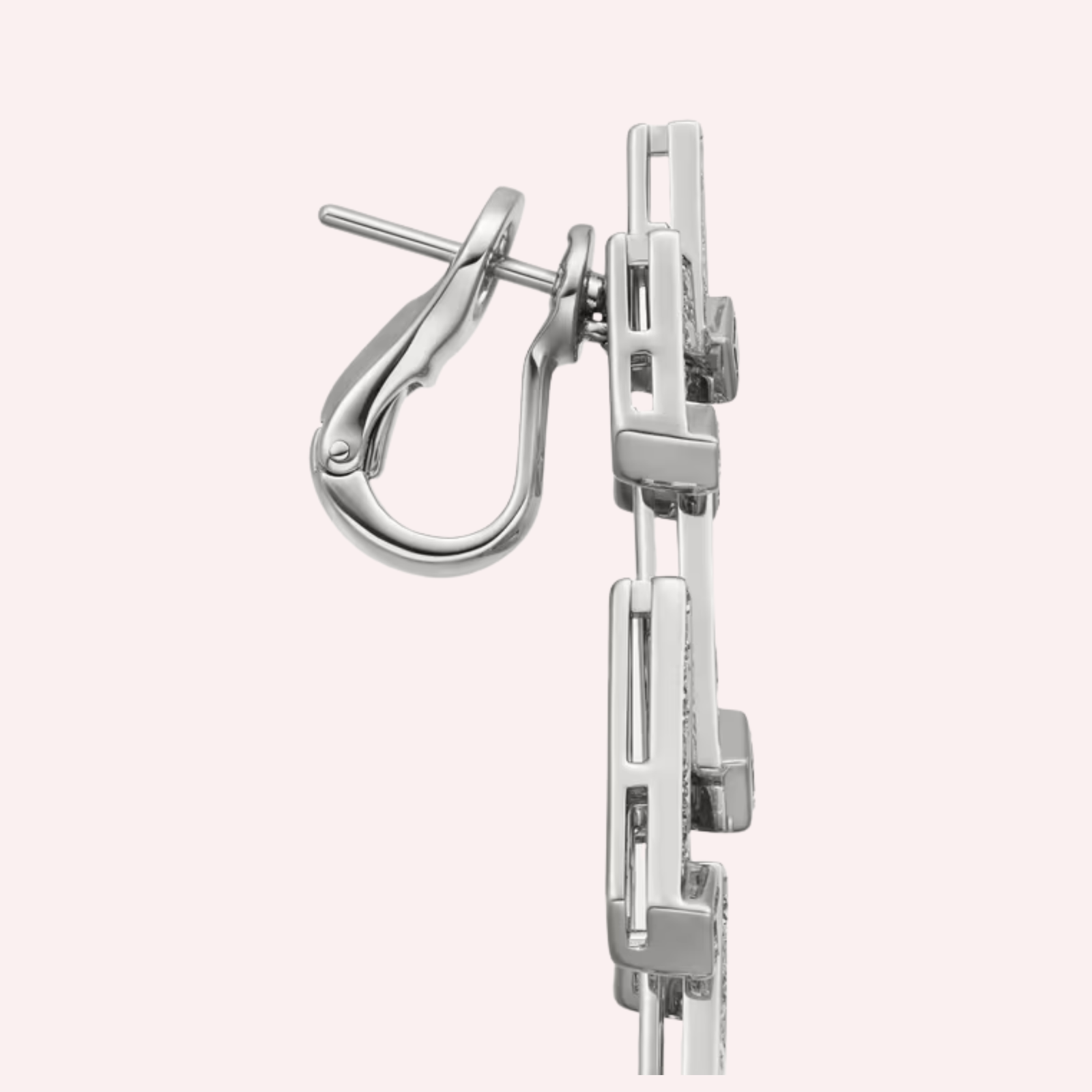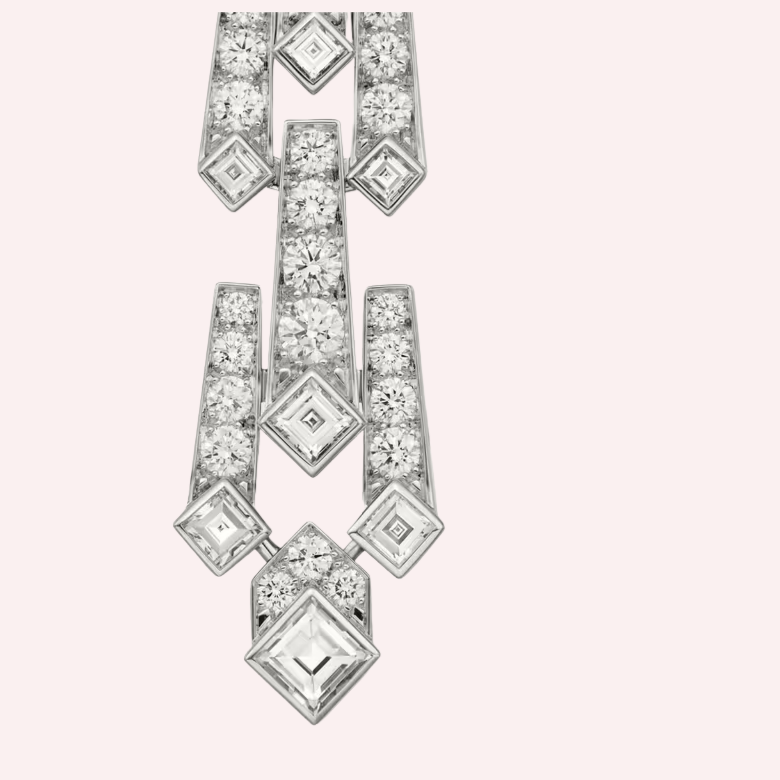 Crafted in 18K white gold (750/1000), each earring is set with five square-shaped diamonds and thirty-six brilliant-cut diamonds, together totaling 4.68 carats. The harmonious interplay of geometric and round diamond cuts enhances depth and radiance, resulting in a refined silhouette that reflects Cartier’s mastery of proportion, light, and exceptional craftsmanship.