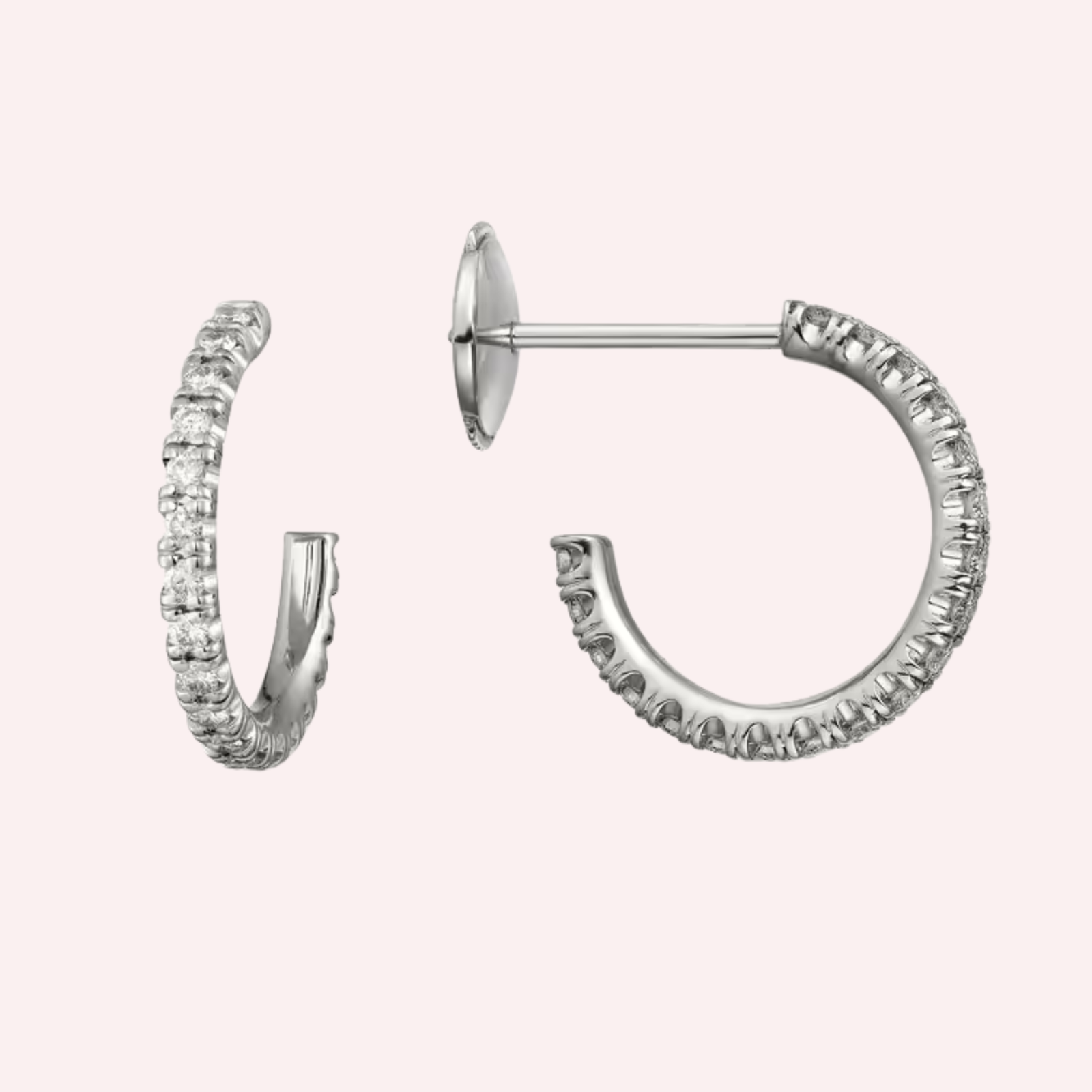 Crafted in luminous 18K white gold (750/1000), these small-model hoop earrings are each set with 19 brilliant-cut diamonds totaling 0.27 carats. The finely pavé diamonds trace the gentle curve of the hoops, offering a soft, continuous sparkle while maintaining a light and sophisticated silhouette.