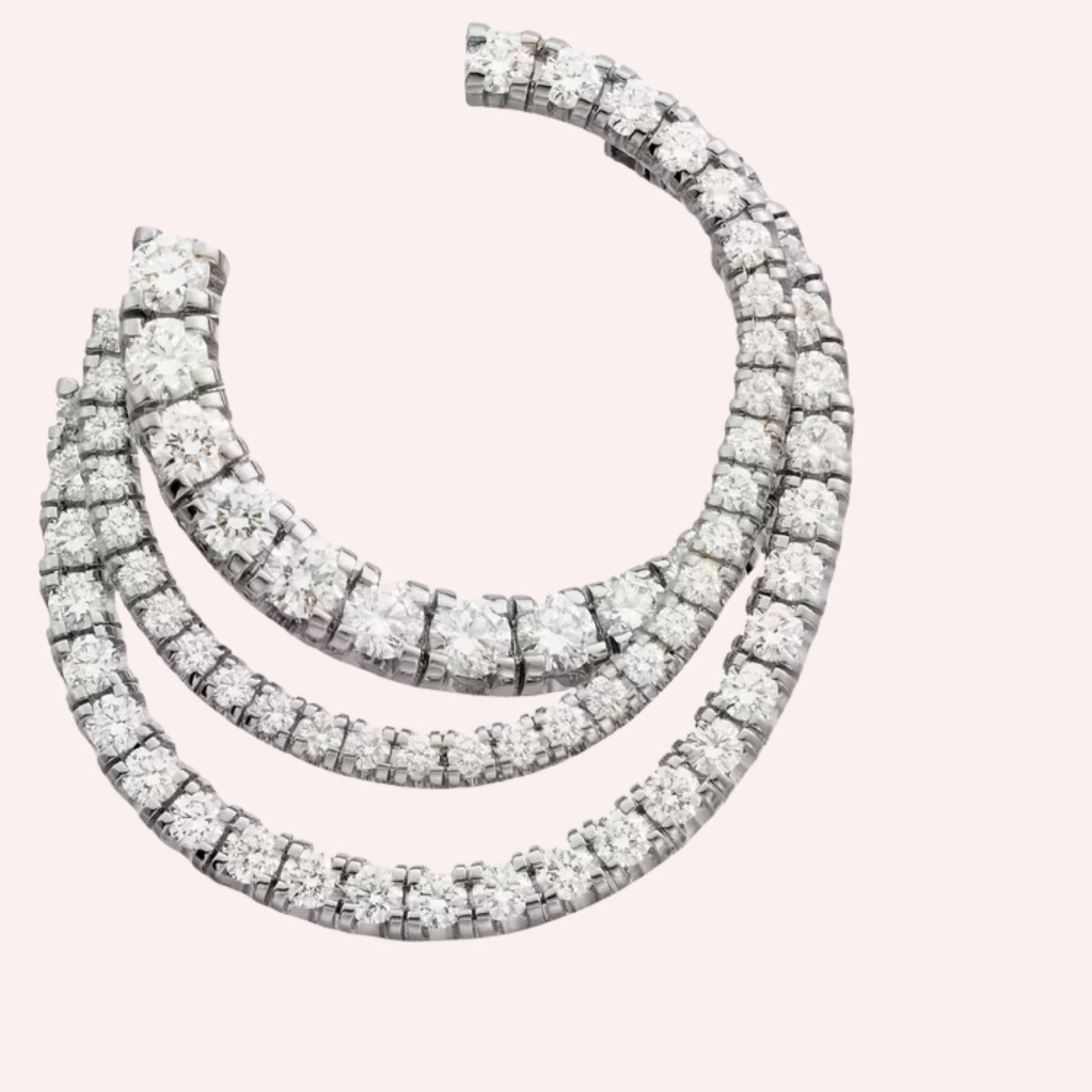 Crafted in luminous 18K white gold (750/1000), these triple-row pavé hoop earrings are each set with 74 brilliant-cut diamonds totaling 1.73 carats. The three rows of finely pavé-set diamonds form a continuous surface of sparkle, enhancing the sculptural curve of the hoops while maintaining a light, elegant presence.