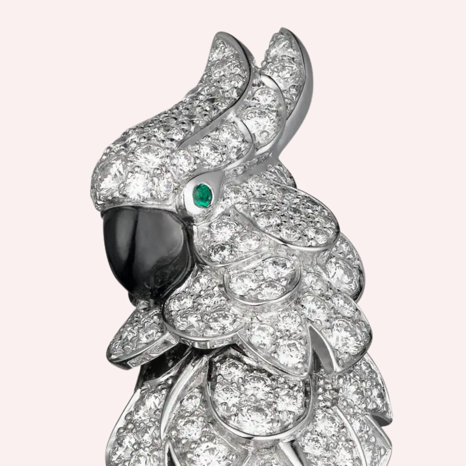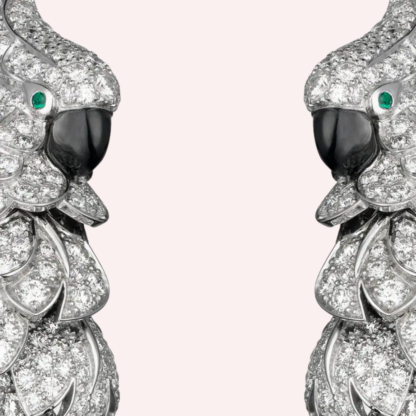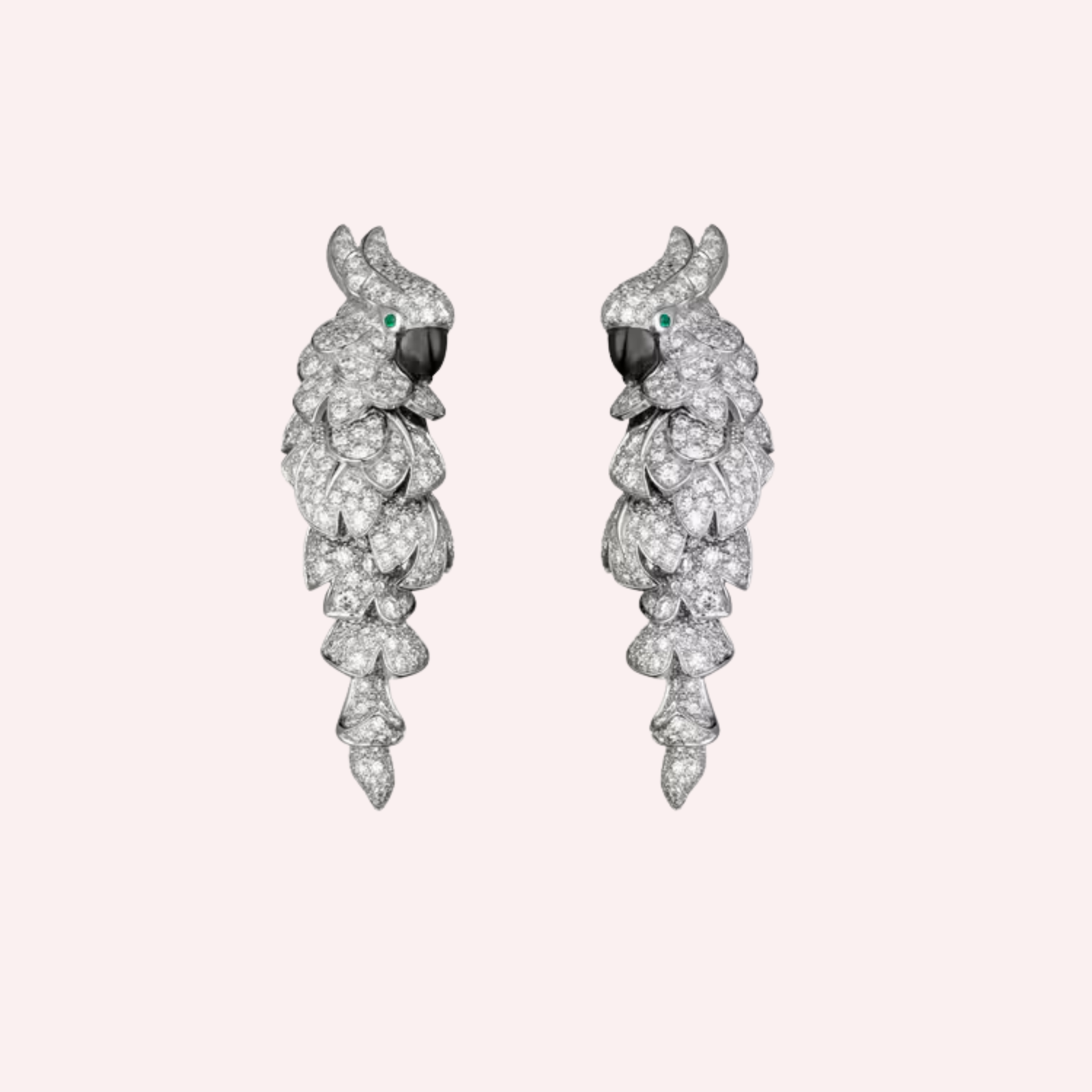 Expertly crafted in luminous 18K white gold, each earring is set with 237 brilliant-cut diamonds, for a total diamond weight of 2.03 carats, creating a radiant pavé that enhances the sculptural silhouette. Accented with vivid emeralds and luminous mother-of-pearl, the earrings reveal Cartier’s exceptional mastery of stones, volume, and color harmony. Elegant yet powerful, they reflect the Maison’s enduring Flora and Fauna universe with refined sophistication.