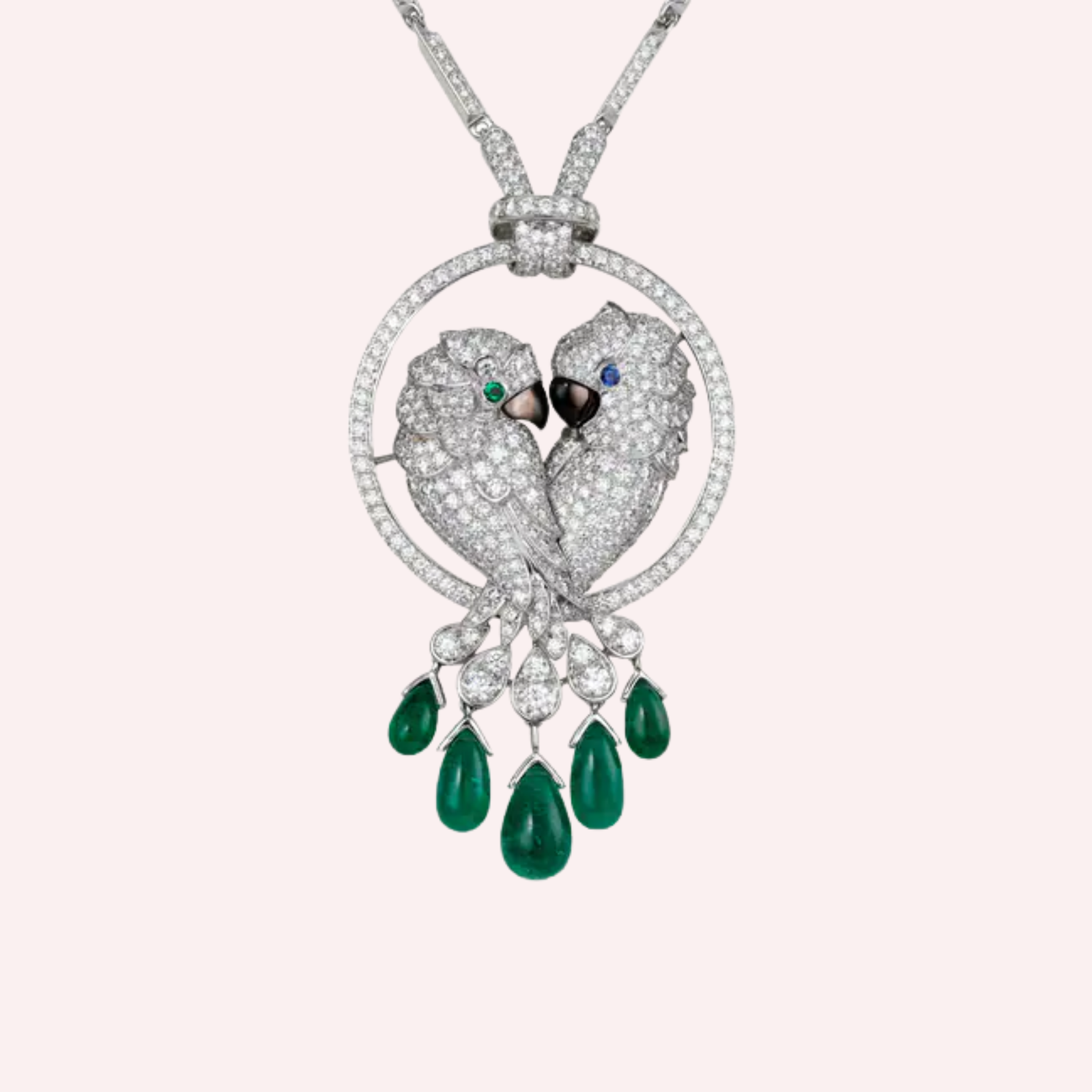 A Pre-Owned Cartier Faune et Flore Les Oiseaux Libérés pavé necklace in 18K white gold, featuring emerald drops, mother-of-pearl, sapphire, and 6.49 carats of diamonds.