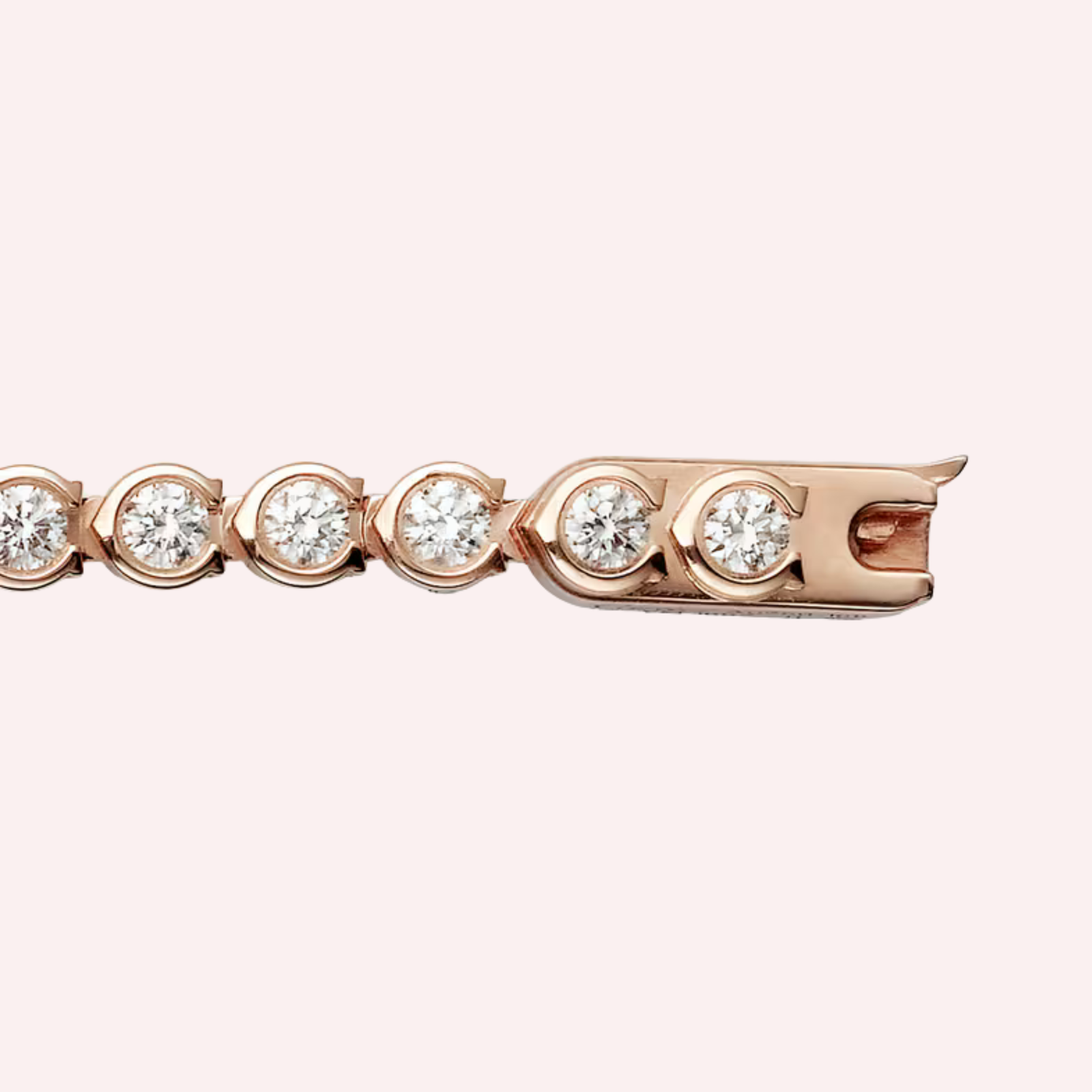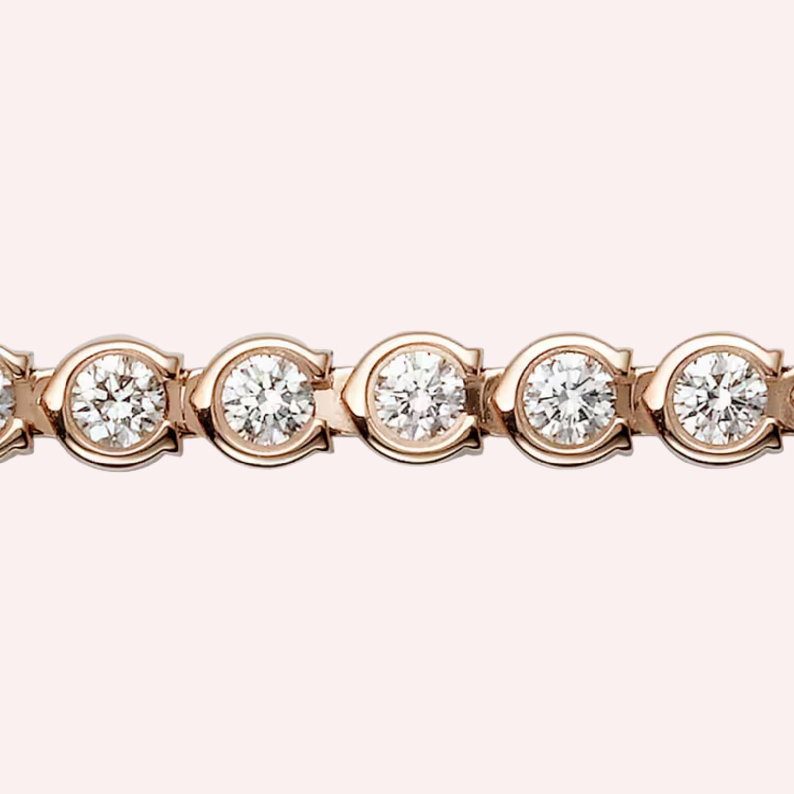 Expertly crafted in warm 18K rose gold (750/1000), the bracelet is set with 55 brilliant-cut diamonds totaling 1.53 carats (for size 17). Each diamond is meticulously arranged to create a seamless flow of brilliance, enhancing the bracelet’s sleek and contemporary silhouette. A graceful balance of luxury and minimalism, this piece is ideal for both everyday elegance and special occasions.