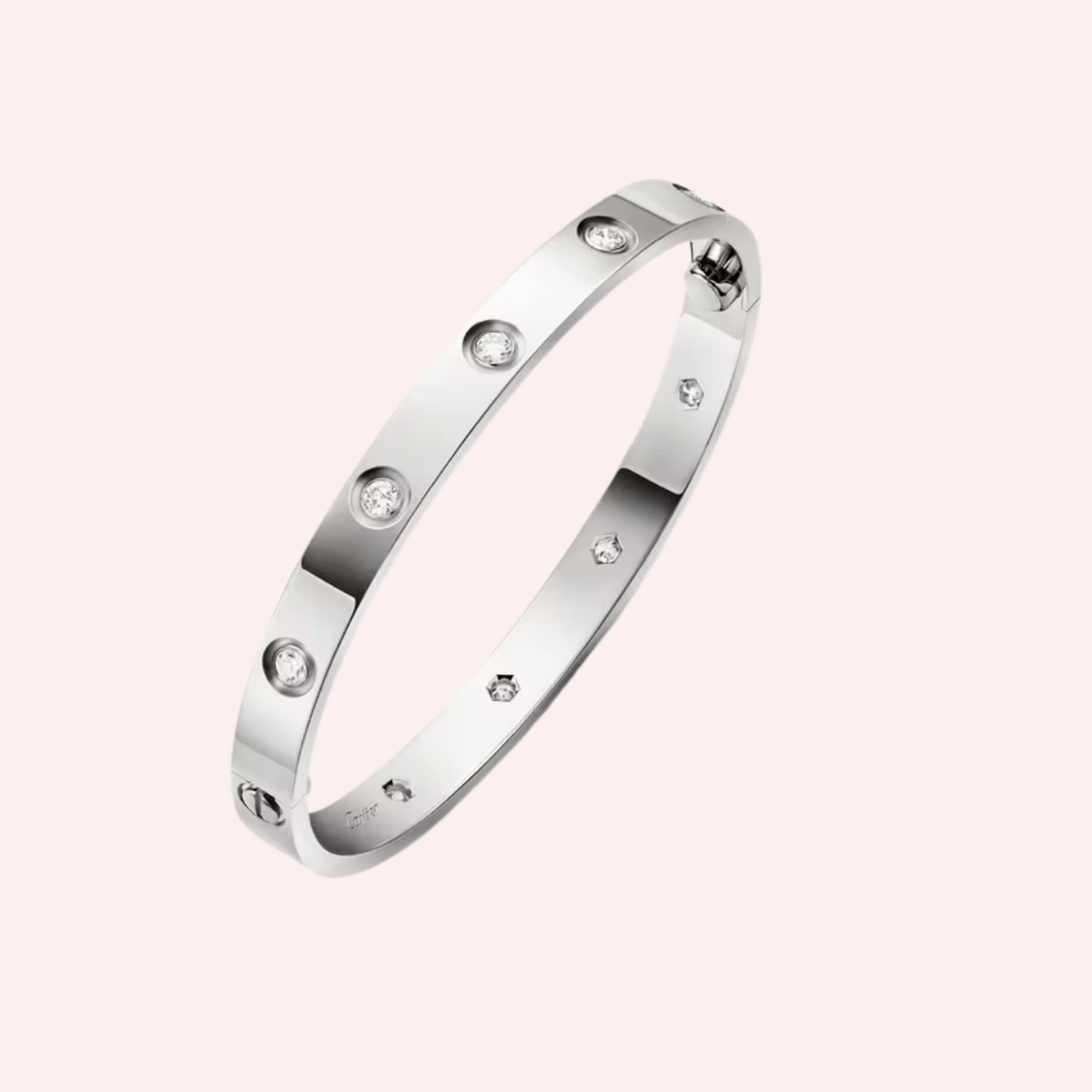 A timeless Pre-Owned Cartier LOVE bracelet in 18K white gold, set with 10 brilliant-cut diamonds for understated luxury.