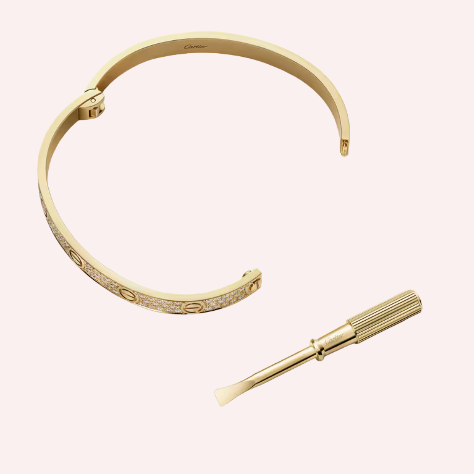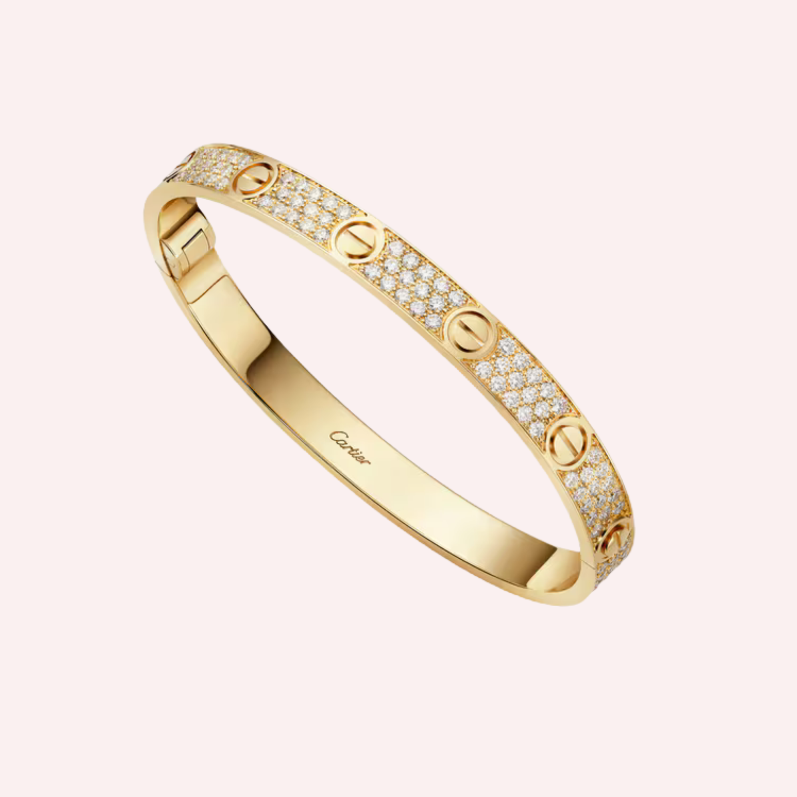 Crafted in 18K yellow gold (750/1000), this classic model LOVE bracelet is fully pavé-set with 165 brilliant-cut diamonds totaling 3.07 carats (for size 17), bringing exceptional radiance to the iconic design. Measuring 6.1 mm in width, it features a functional screw and hinge fastening system, preserving both the aesthetic and symbolic integrity of the collection. Timeless, powerful, and instantly recognizable, this bracelet exemplifies Cartier’s mastery of form, symbolism, and high jewelry craftsmanship.