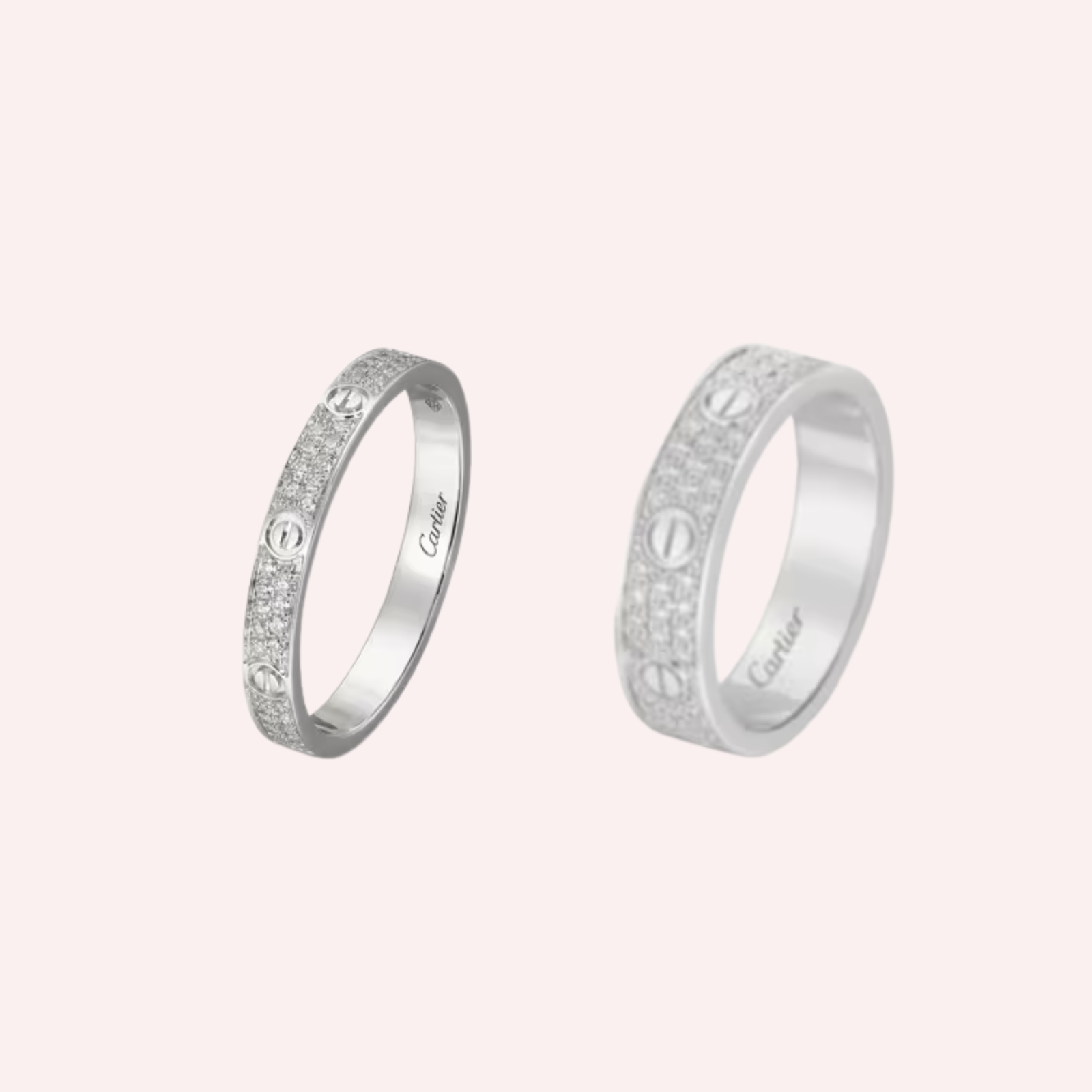 Crafted in luminous 18K white gold, the mini model is exquisitely pavé-set with 72 brilliant-cut diamonds totaling 0.19 carat (for size 52), adding delicate brilliance to its sleek silhouette. With a refined width of 2.6 mm, the ring offers understated elegance and modern versatility, making it ideal for stacking or everyday wear while remaining unmistakably Cartier in craftsmanship and design.