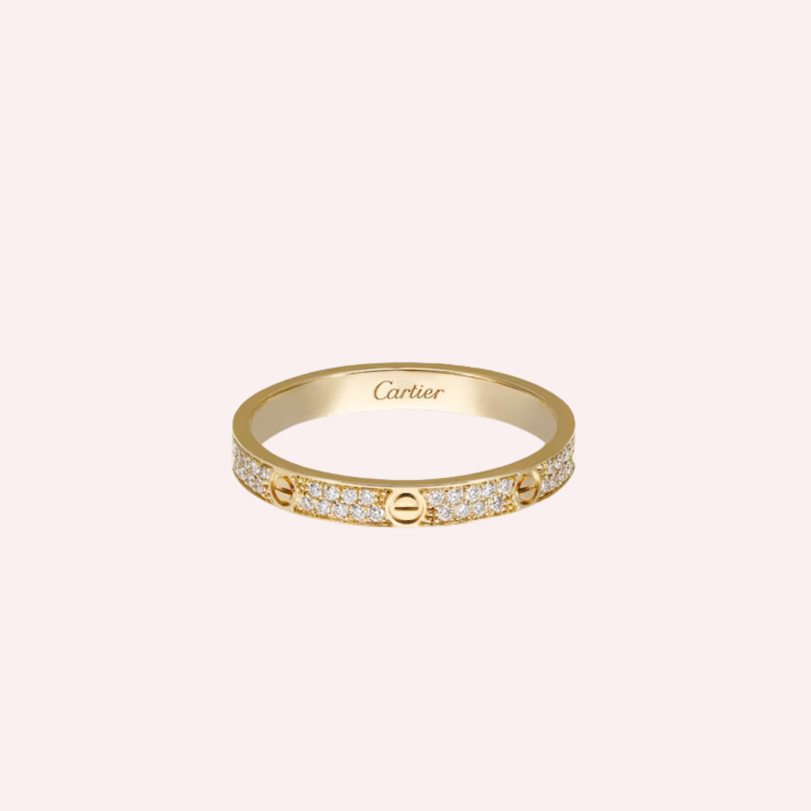 Crafted in radiant 18K yellow gold, the mini model is elegantly pavé-set with 72 brilliant-cut diamonds totaling 0.19 carat (for size 52), lending subtle brilliance to its slim silhouette. With a refined width of 2.6 mm, the ring offers a graceful balance of sparkle and minimalism, making it ideal for stacking or understated everyday wear while remaining unmistakably Cartier.