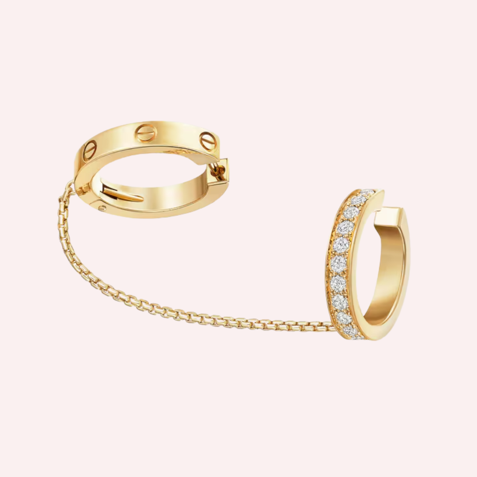 Crafted in luminous 18K yellow gold (750/1000), this versatile single earring features a multiwear design that allows for contemporary styling and personal expression. It is set with 19 brilliant-cut diamonds totaling 0.34 carat, delicately half-pavé to enhance the design with radiant brilliance. The earring presents a refined balance of proportions, with each band measuring approximately 3 mm in width and 15 mm in diameter, complemented by a chain length of 40 mm. Elegant yet distinctive, this piece reflects Cartier’s mastery of form, movement, and modern luxury.