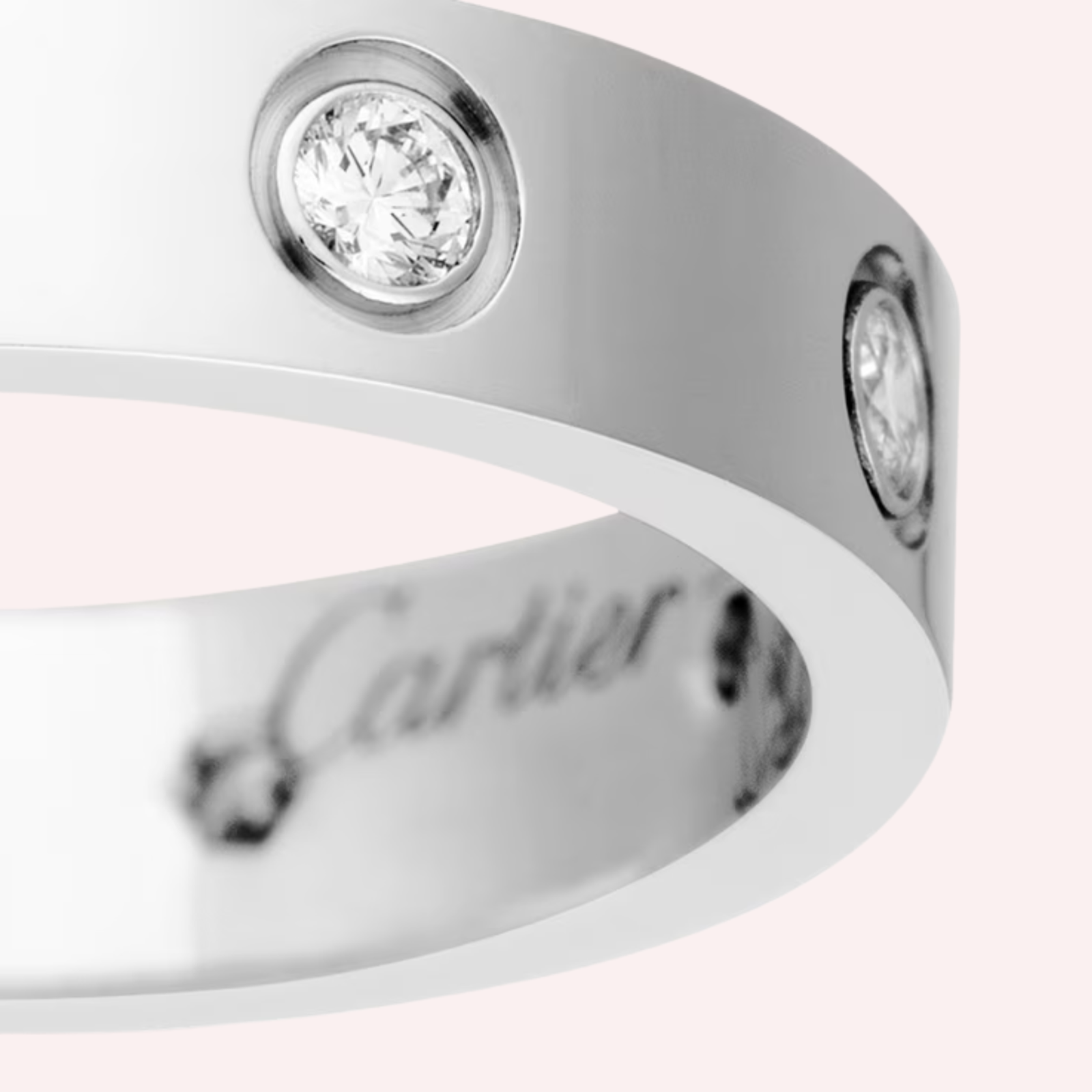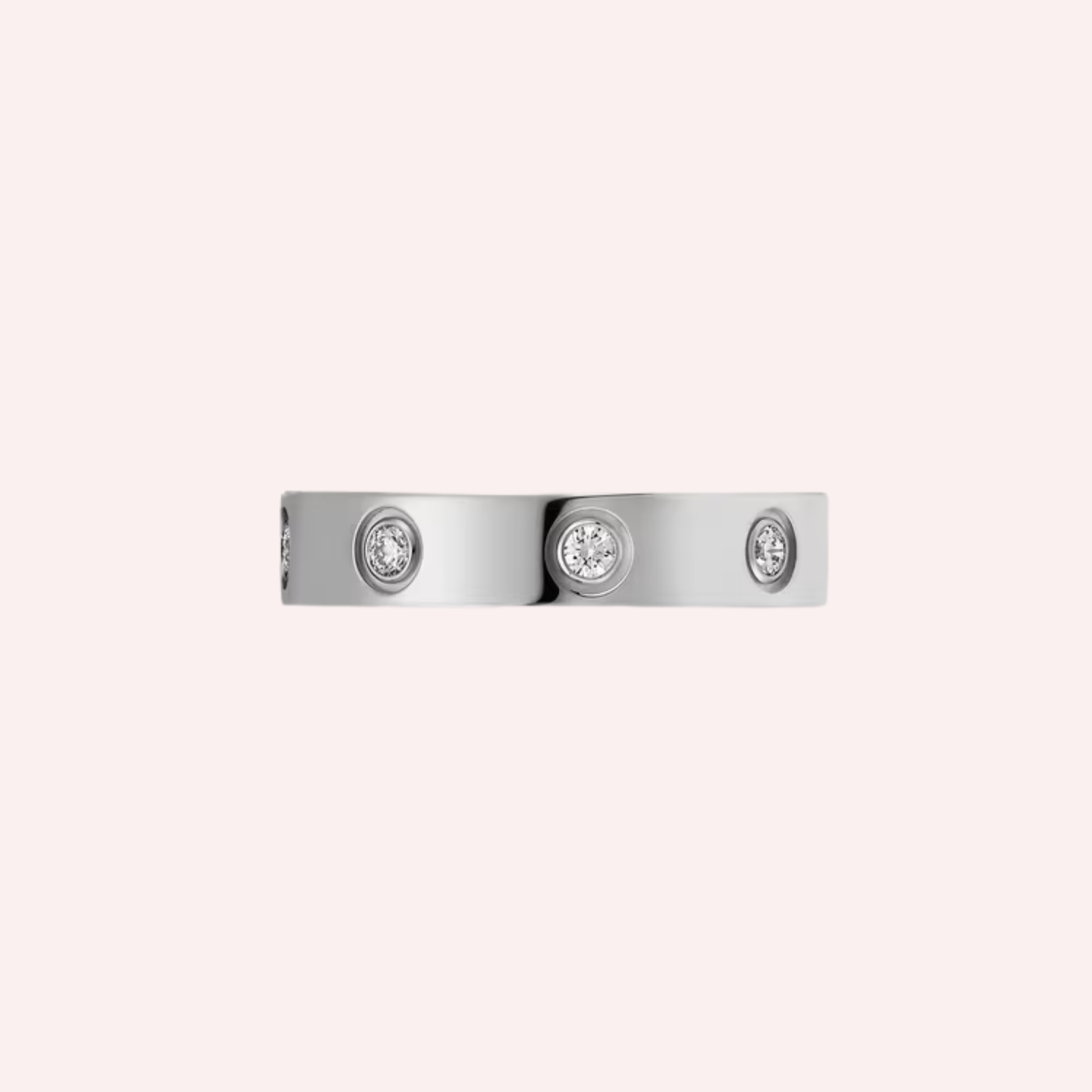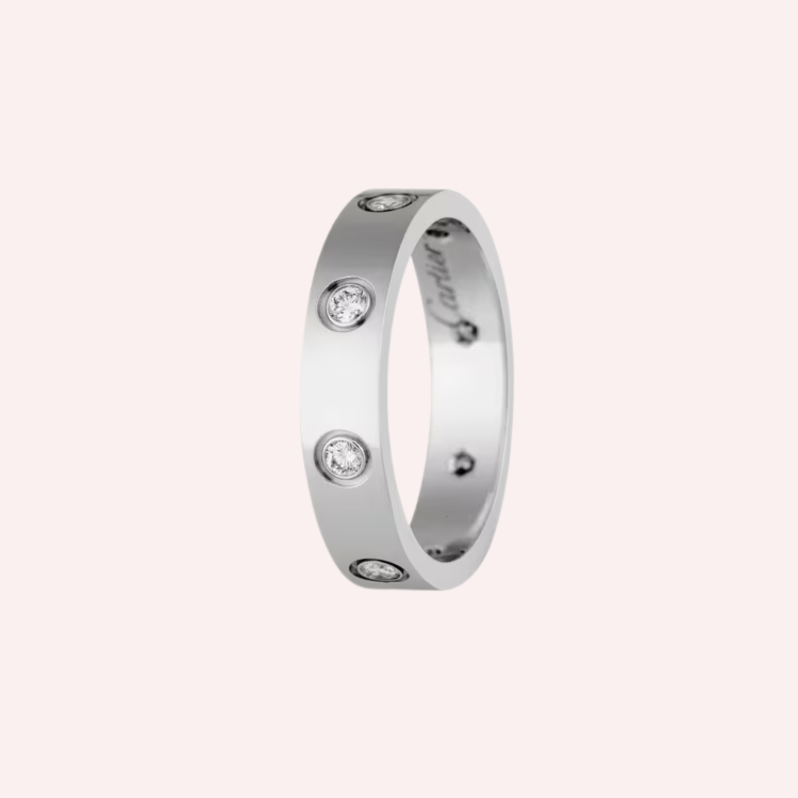 Crafted in luminous 18K white gold, the ring is elegantly set with eight brilliant-cut diamonds totaling 0.19 carat, adding refined sparkle to its clean, architectural silhouette. With a width of 4 mm, the small model offers a balanced and contemporary presence—distinctive yet versatile—perfectly reflecting Cartier’s mastery of timeless design and exceptional craftsmanship.