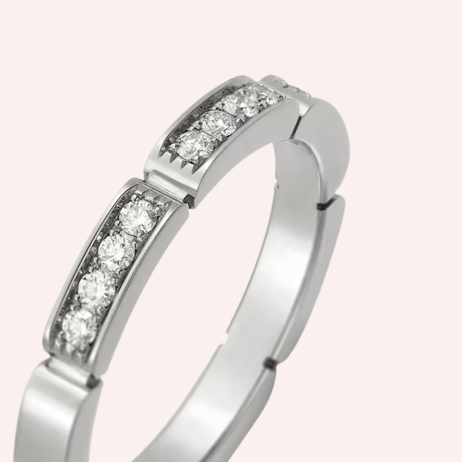 An exquisite expression of Cartier’s iconic Panthère heritage, this Pre-Owned Maillon Panthère half-paved wedding band captures the Maison’s signature harmony of strength and fluidity. Inspired by the supple, sensual movement of the Panthère jewels, the refined chain-inspired design is enhanced with twelve brilliant-cut diamonds totaling 0.15 carat. Meticulously crafted in luminous 18K white gold (750/1000), the band features a sleek width of 2.5 mm and a thickness of 2 mm (for size 52), offering a sophisticated balance of modern brilliance and timeless elegance.