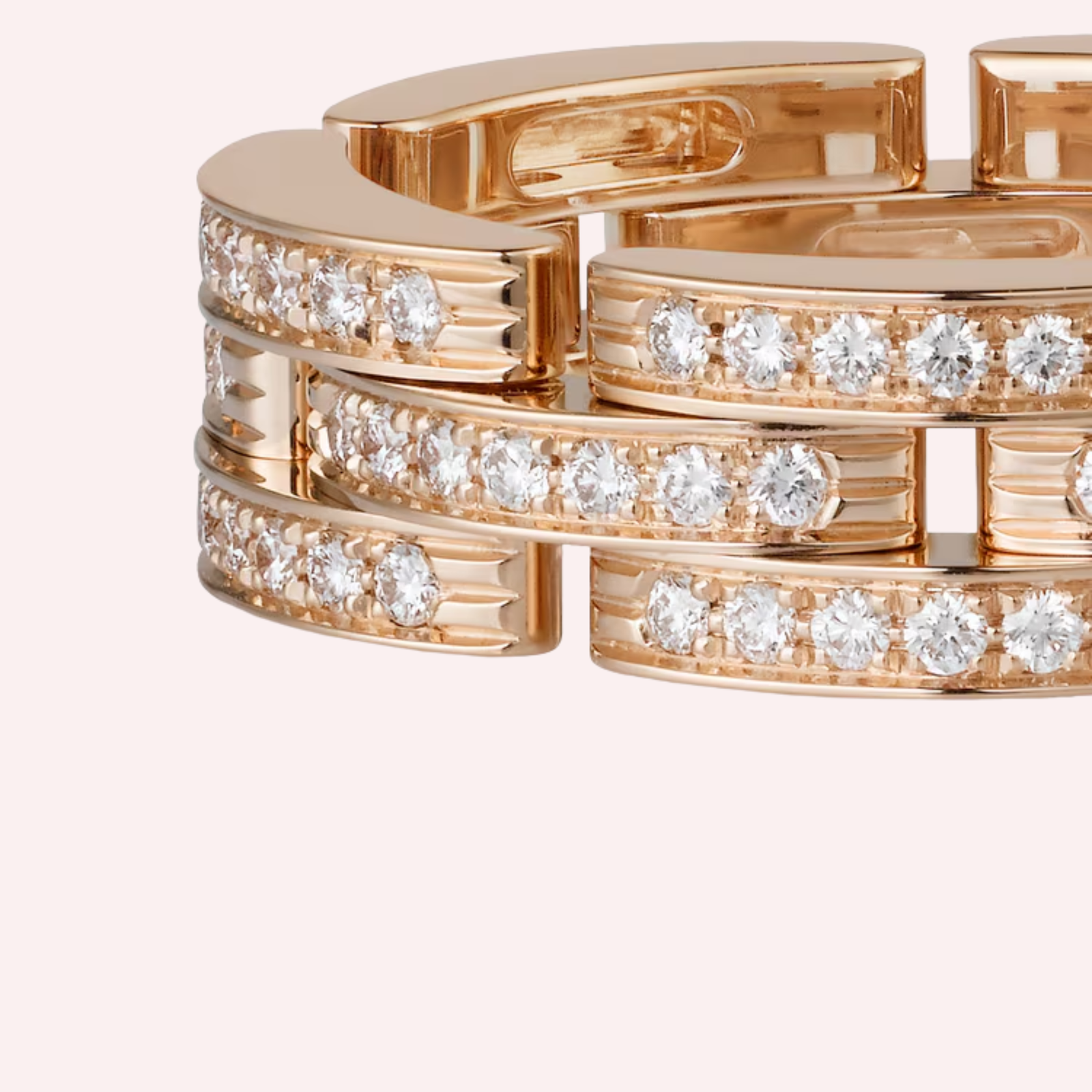 Expertly crafted in 18K rose gold (750/1000), the ring features a bold triple-row design fully pavé-set with 175 brilliant-cut diamonds totaling 1.26 carats (for size 52). The continuous diamond setting accentuates the fluid geometry of the links, creating a radiant surface that captures light from every angle. Striking yet sophisticated, this ring stands as a powerful statement of Cartier’s high jewelry savoir-faire.