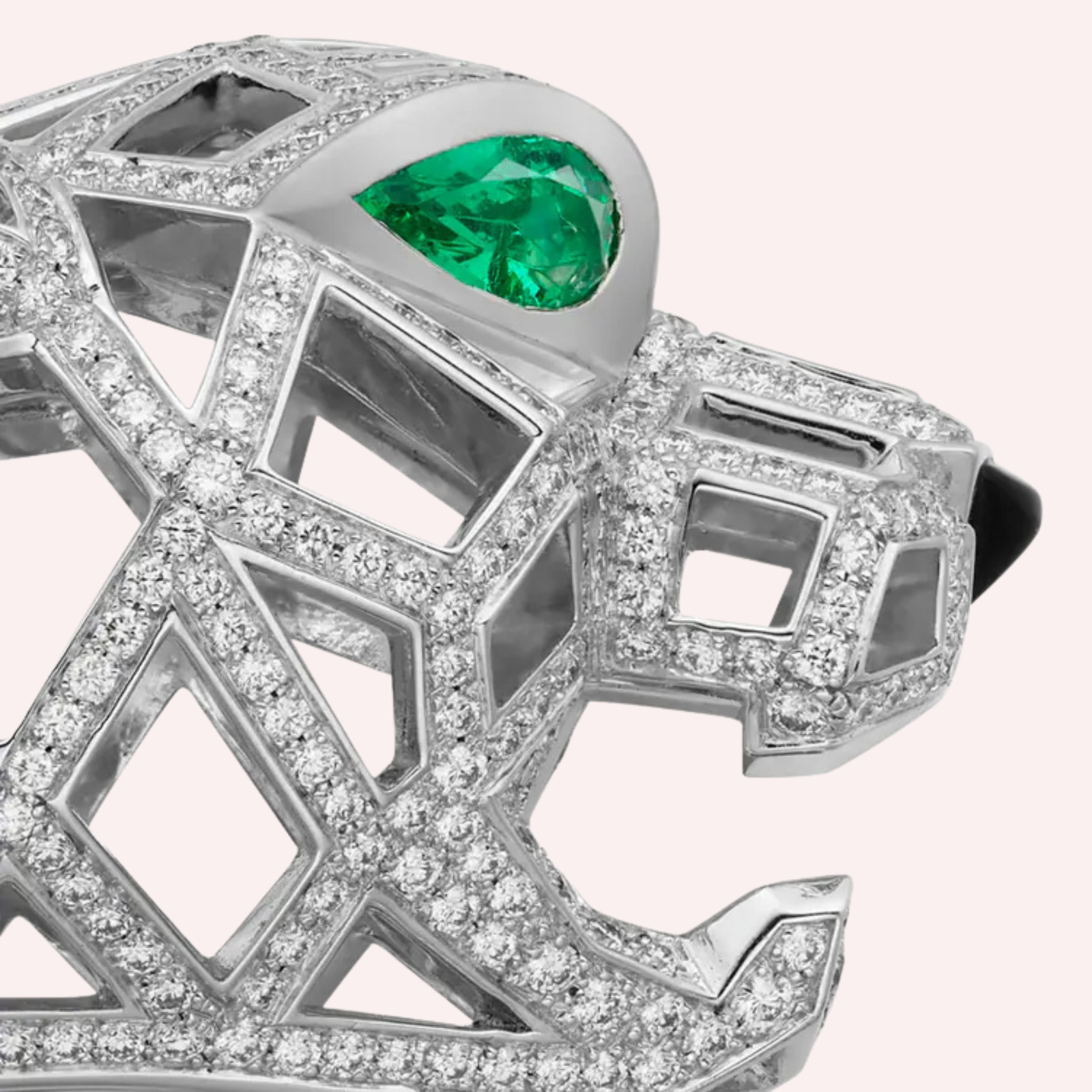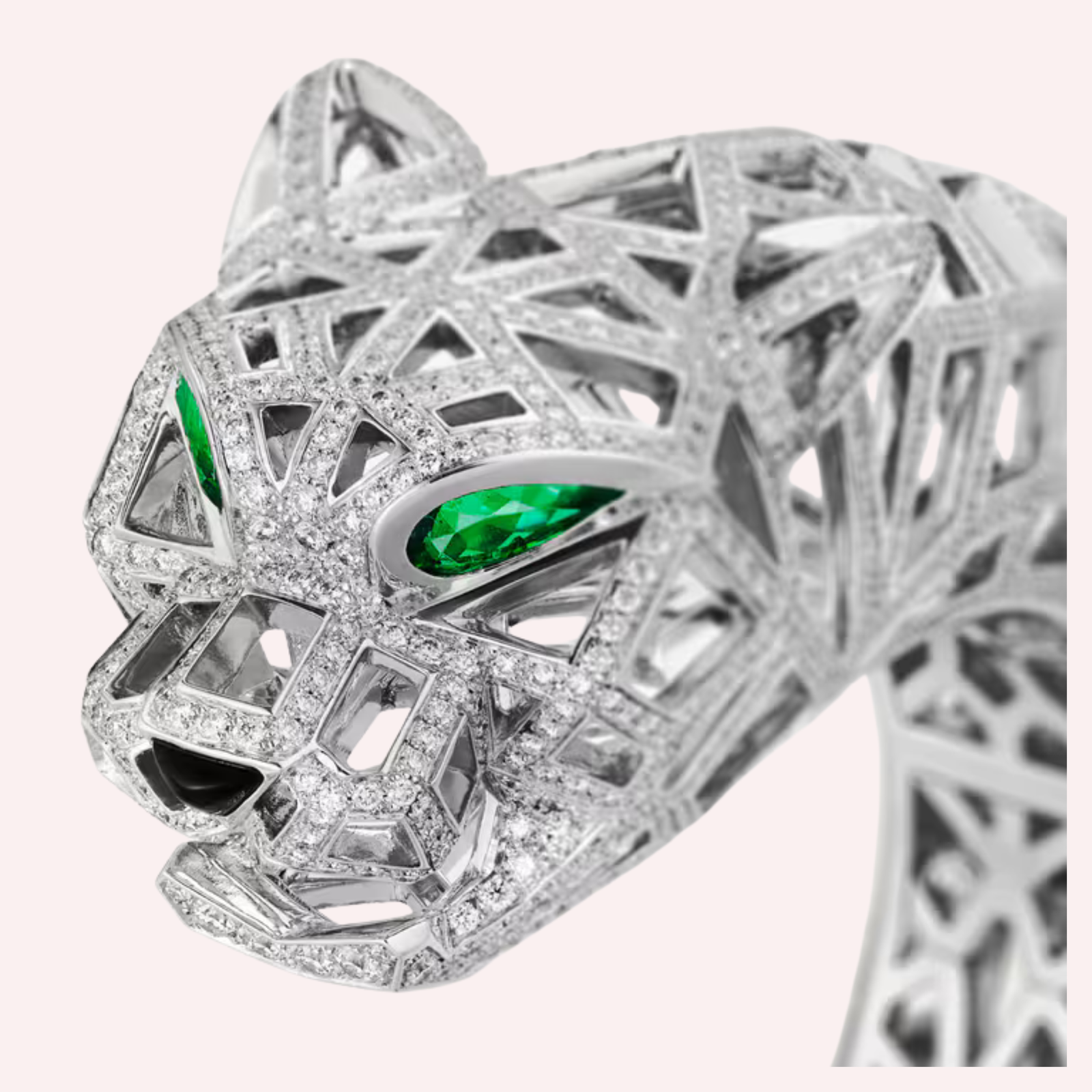 Crafted in luminous 18K white gold (750/1000), this extraordinary Panthère de Cartier bracelet showcases refined high jewelry craftsmanship. The sculptural feline is brought to life with two vivid emerald eyes and a striking onyx nose, creating dramatic depth and contrast. The bracelet is lavishly pavé-set with 827 brilliant-cut diamonds totaling 5.46 carats (for size 17), delivering radiant brilliance while enhancing the panther’s powerful presence. This masterpiece is a true statement of artistry, luxury, and timeless sophistication.