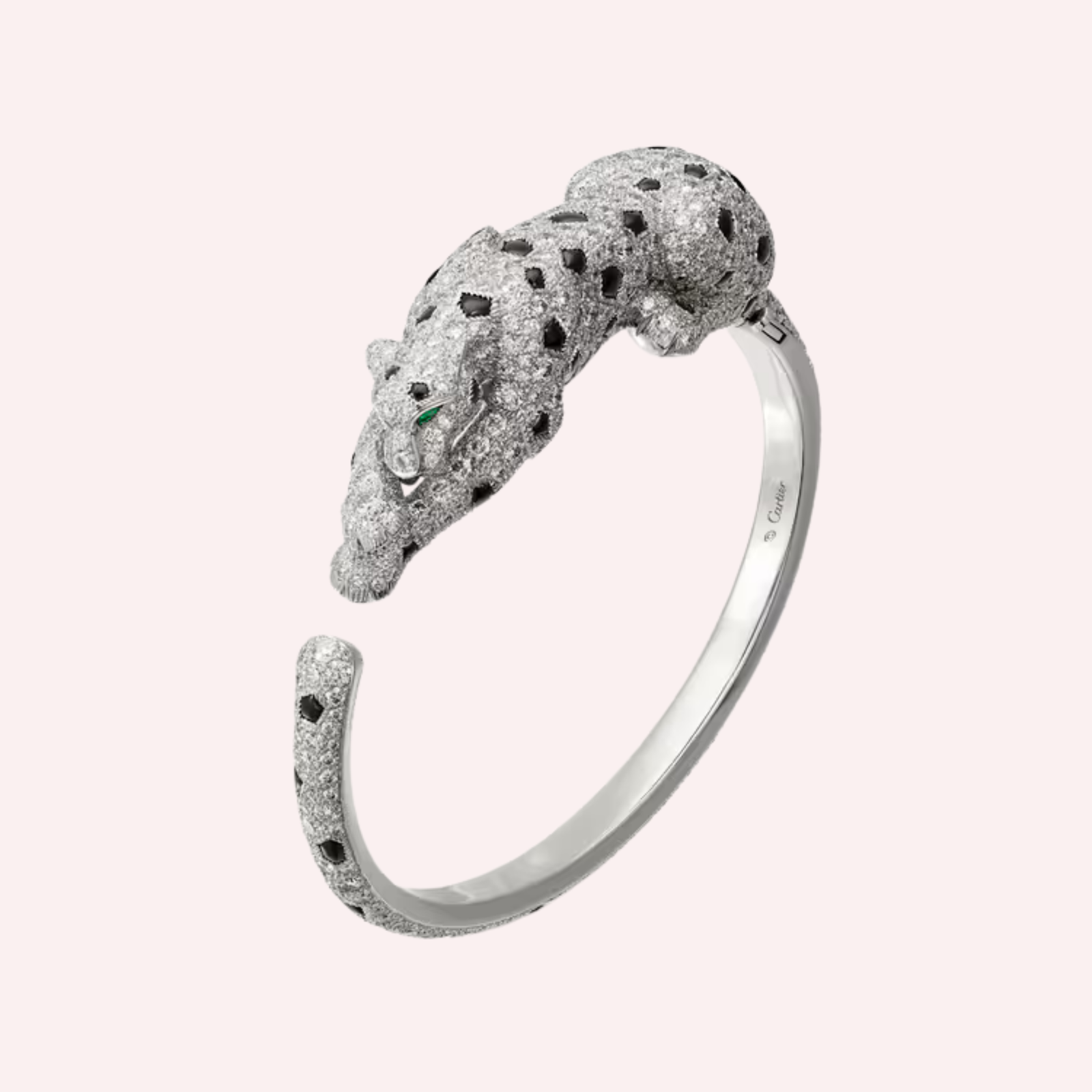 An extraordinary Pre-Owned Cartier Panthère bracelet in white gold, fully pavé-set with diamonds and accented with emeralds and onyx.