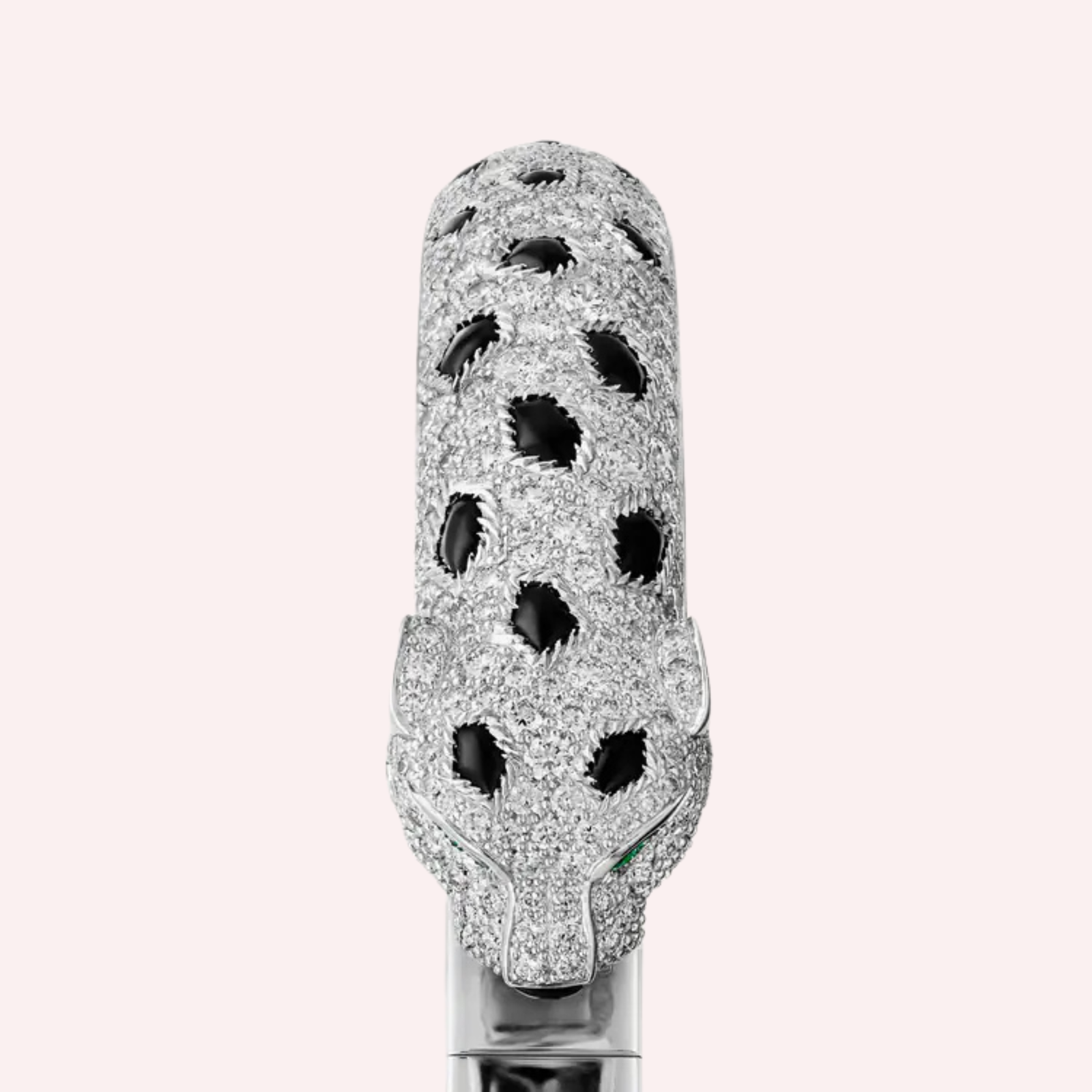 Crafted in luminous 18K white gold (750/1000), this medium model Panthère de Cartier bracelet presents a striking sculptural silhouette. The design features deep onyx detailing and is brought to life with two vivid emeralds, accentuating the expressive gaze of the panther. Lavishly pavé-set with 647 brilliant-cut diamonds totaling 7.56 carats, the bracelet radiates exceptional brilliance while preserving the feline’s bold character. Measuring 8.33 mm in width and 4.7 mm in thickness (for size 17), this masterpiece delivers a powerful and luxurious presence on the wrist.