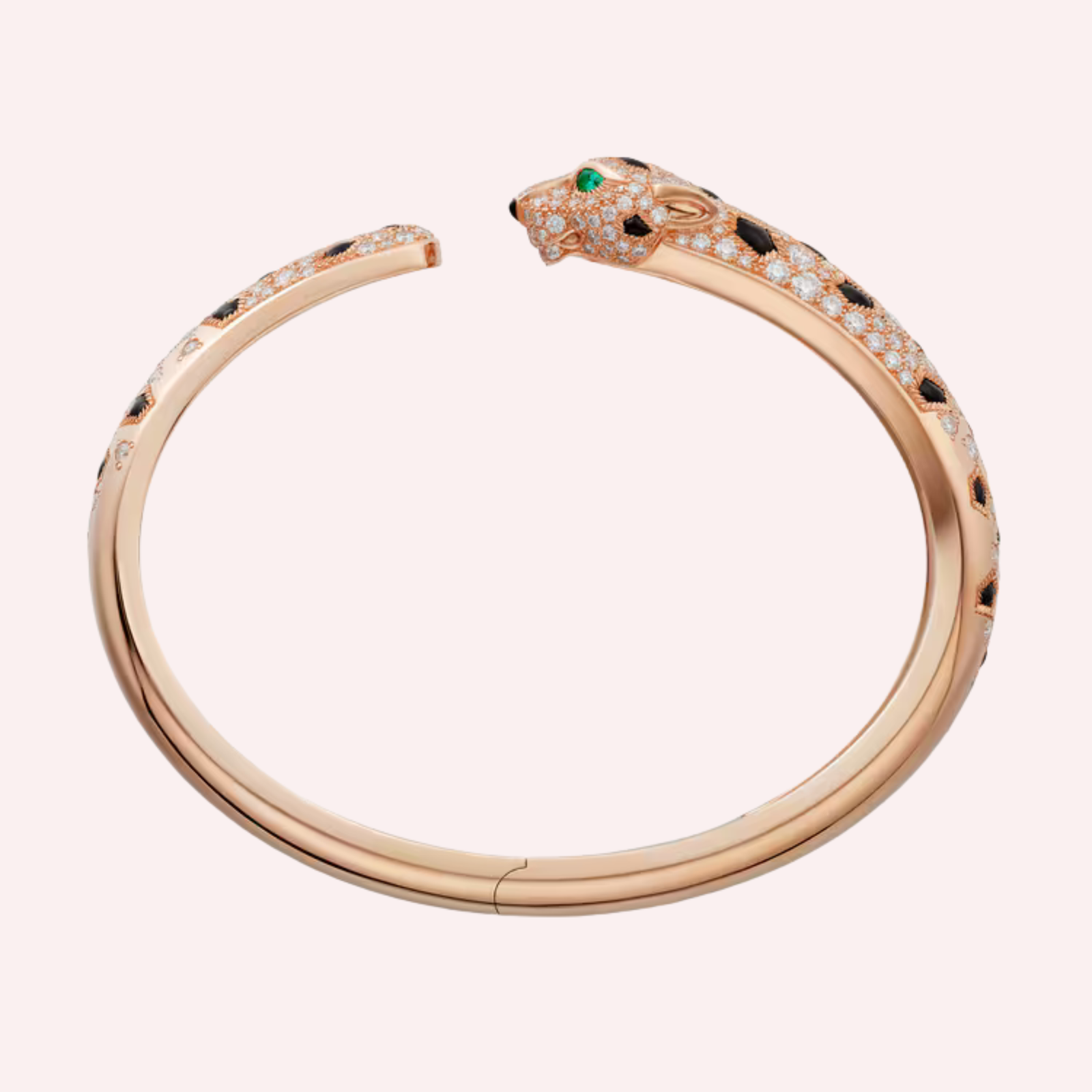 A striking Pre-Owned Cartier Panthère medium bracelet in rose gold, half-pavé set with diamonds and accented with emeralds and onyx.