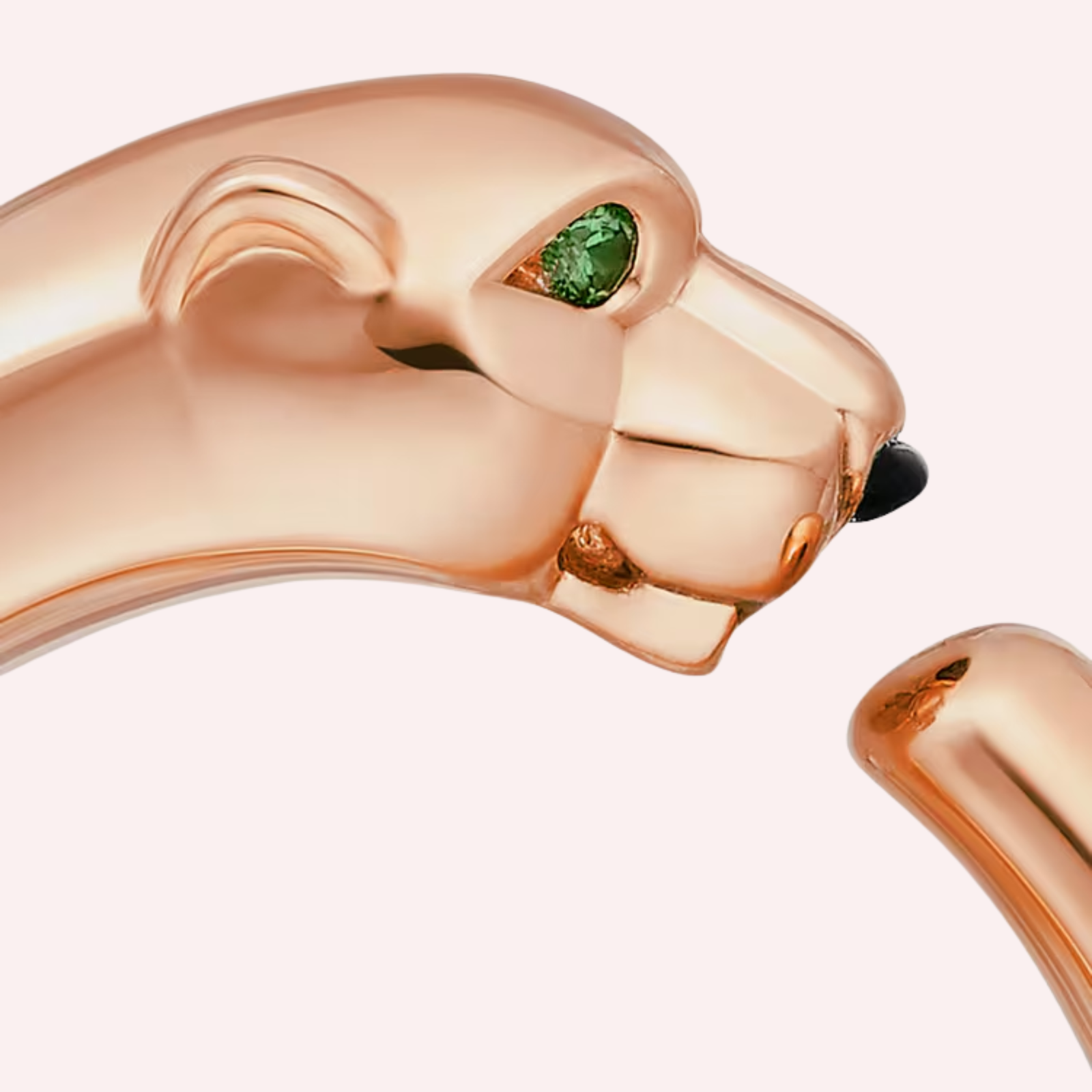 Crafted in warm 18K rose gold (750/1000), this small model ring features the unmistakable panther silhouette, defined by sleek contours and striking contrasts. Polished onyx accents lend depth and intensity, while two vibrant tsavorite garnets bring a vivid touch of color and life to the design (for size 52). With a pattern width of 7.31 mm (for size 52), the ring offers a bold yet refined presence, perfectly reflecting the panther’s multifaceted personality and Cartier’s exceptional craftsmanship.