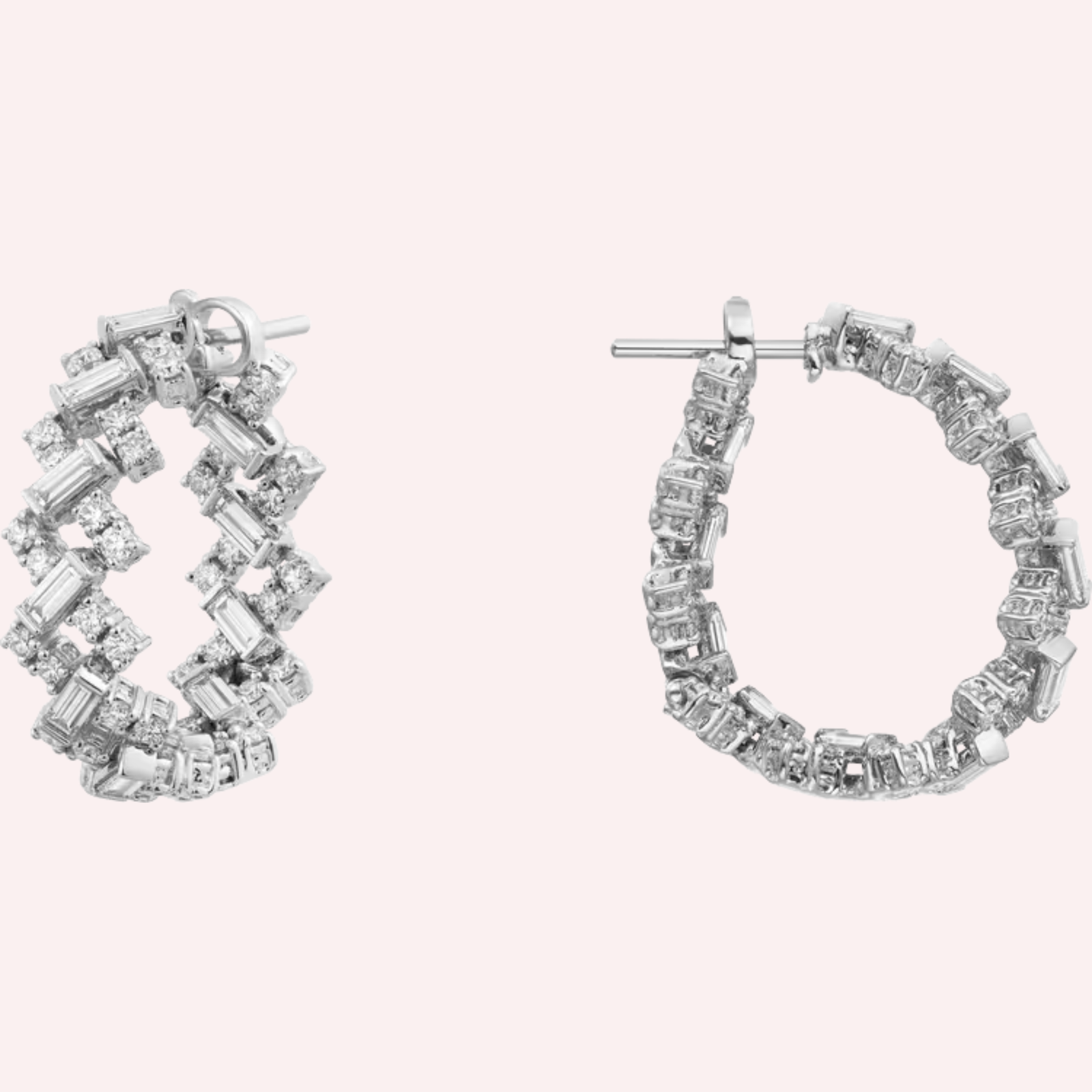 Crafted in luminous 18K white gold (750/1000), these earrings are richly adorned with an exquisite arrangement of diamonds. Each earring is set with 11 baguette-cut diamonds totaling 1.18 carats, paired with 45 brilliant-cut diamonds totaling 1.29 carats. The contrast between linear baguette cuts and radiant brilliant cuts creates depth, rhythm, and extraordinary sparkle, enhanced by meticulous setting and supple metalwork.